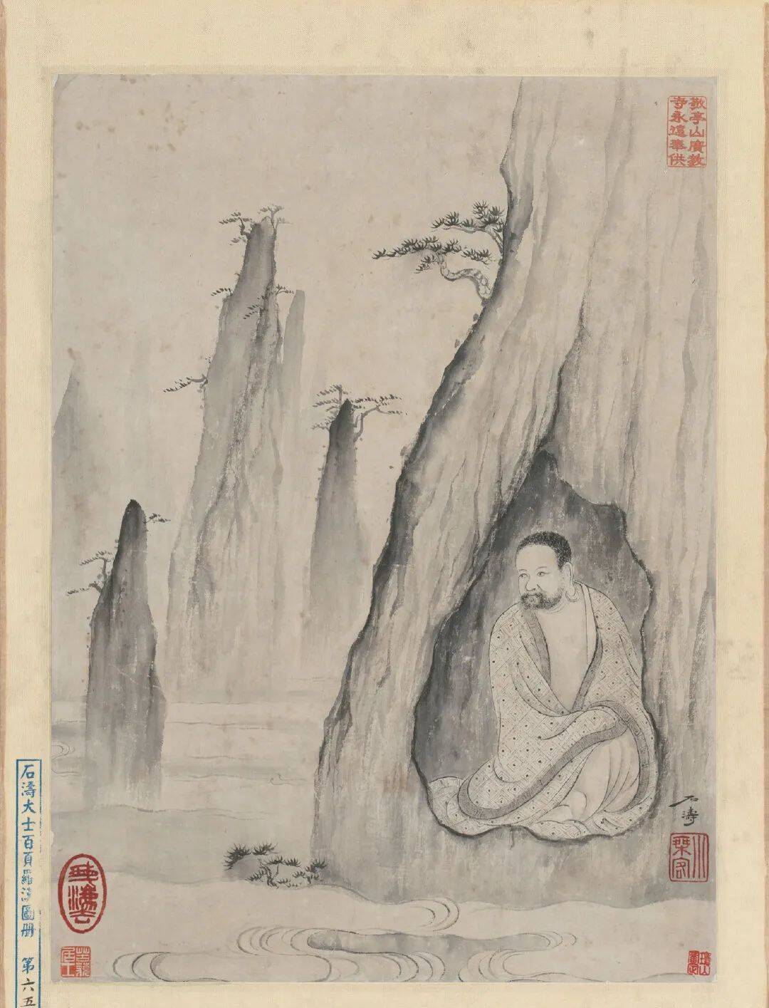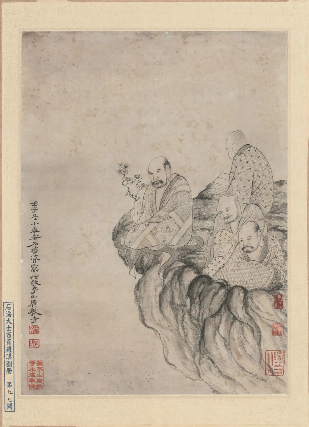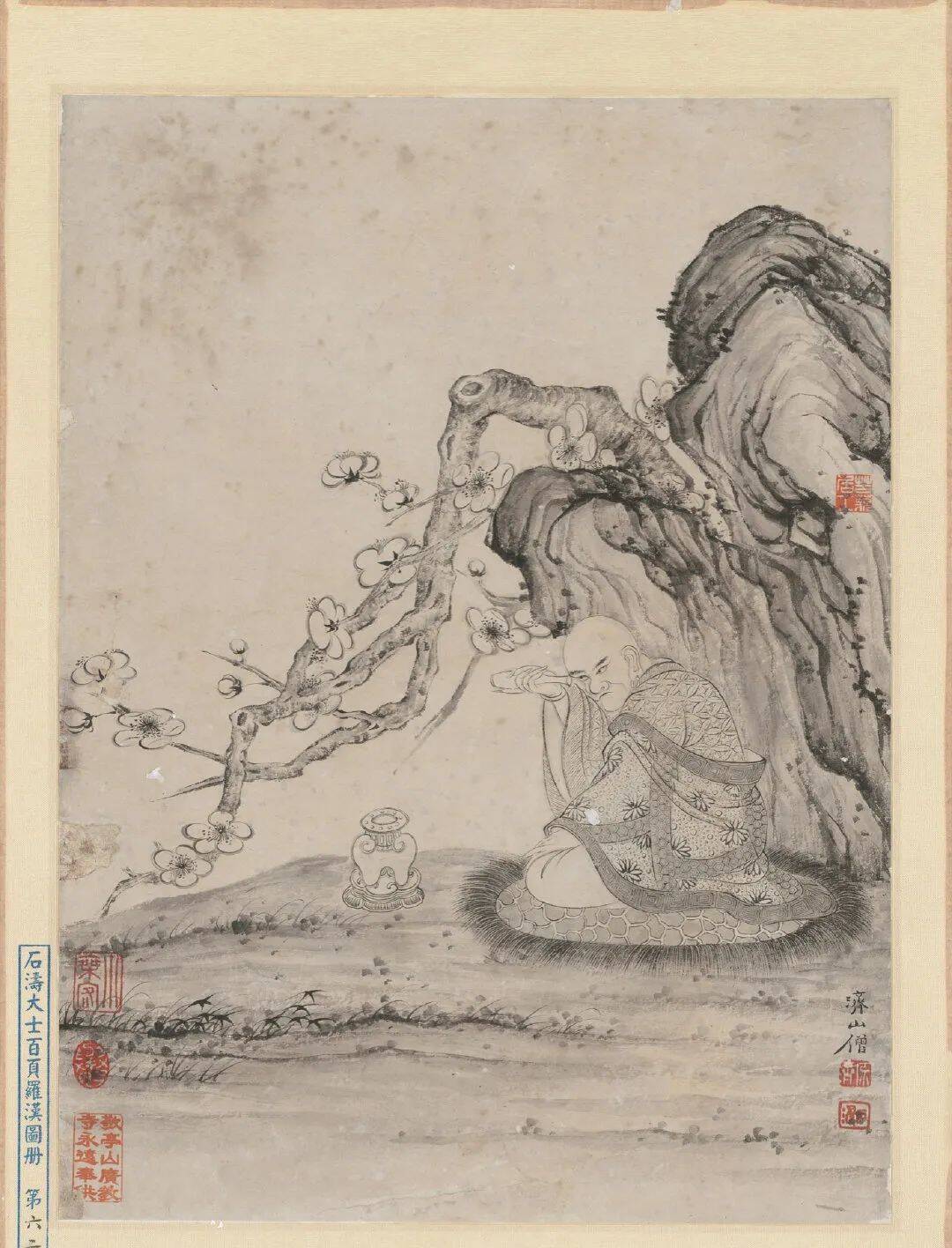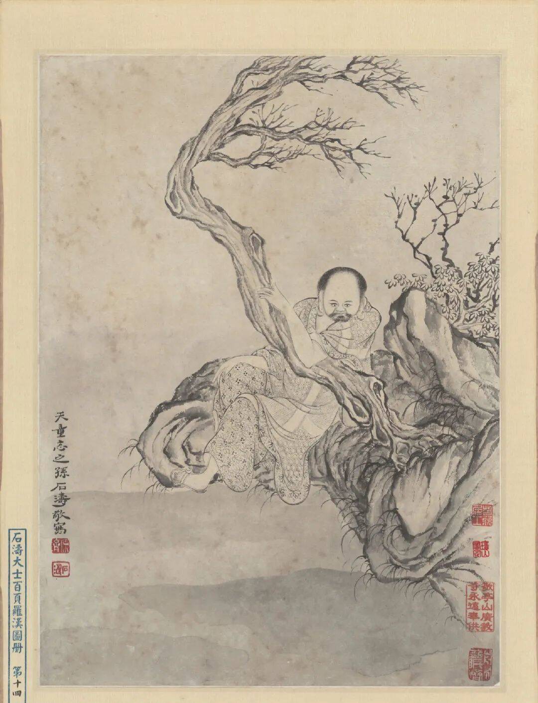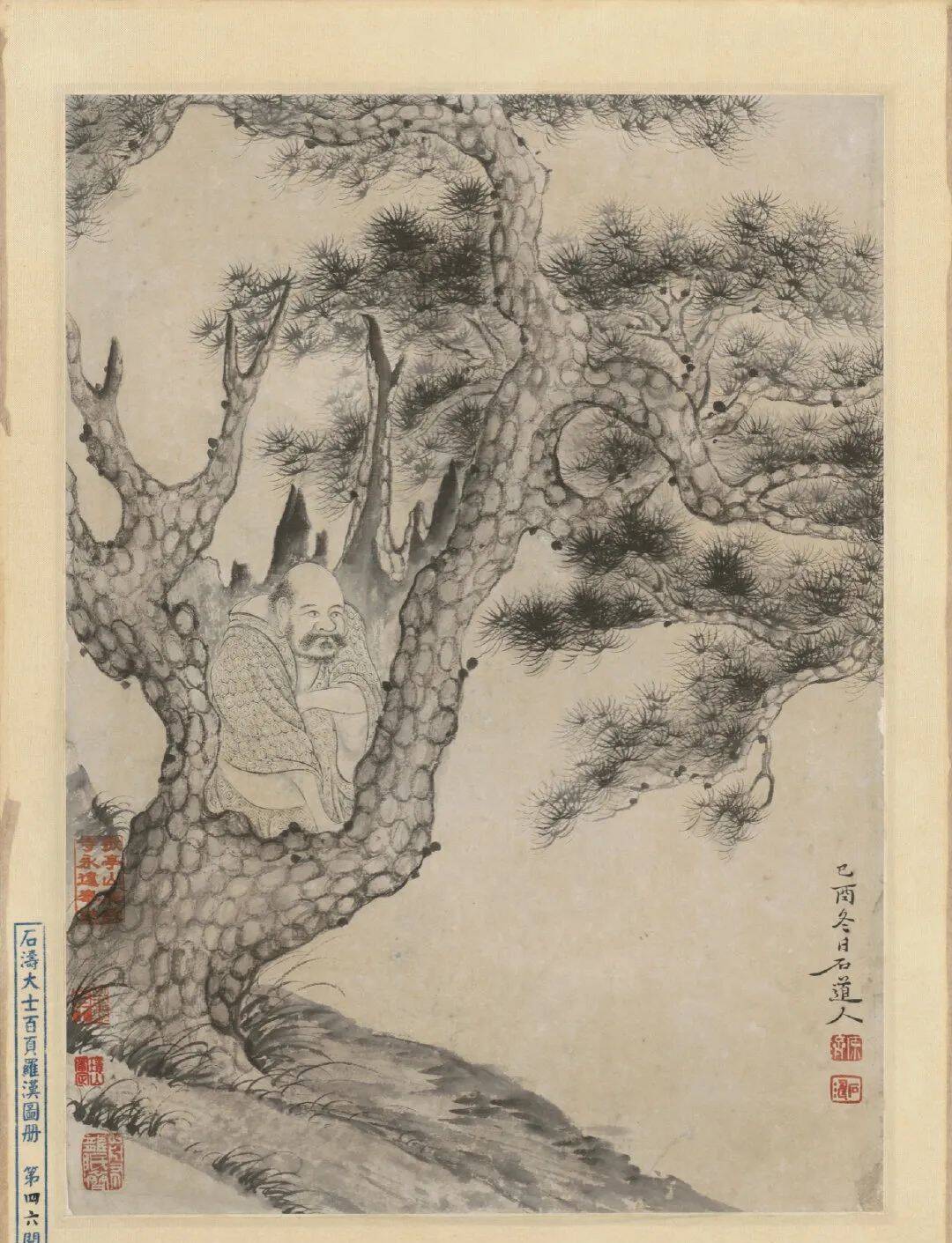 石涛《百开罗汉图册》是石涛青年时期绘制的工笔人物作品,为完整一百开册页,共画山水背景中的罗汉人物310位,各册页中罗汉左右分别陪饰众多人物及似龙、 虎、鹿、狮等神兽形象。根据石涛在画中自题,最早一开创作于“丁未” (1667 年),石涛时年26岁。整套册页作品分别作于1667年、1669年、1670年,1672年,即从石涛的26岁至31岁,历时6年之久,实为石涛倾力之作。