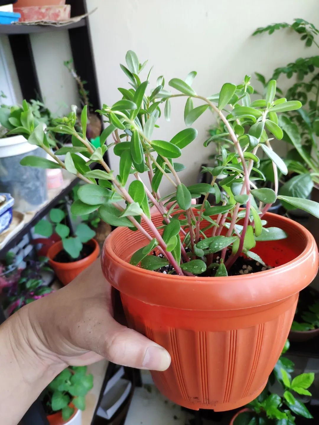 马齿苋的叶子是泪滴状的,叶片比较圆润,和金枝玉叶的叶子特别相似,所以金枝玉叶也会被称作“马齿苋树”。平常马齿苋的叶子都是翠绿色的,如果温差较大,阳光比较充足,叶片边缘处还会呈现红色的状态,而马齿苋的枝条则是红色的,搭配一些黄色的小花,看起来还是挺清新的。