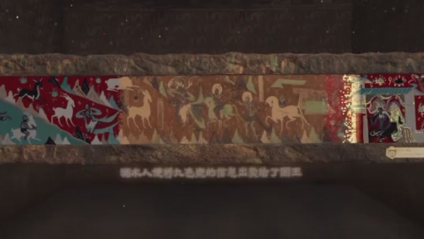 敦煌壁画《鹿王本生图》浮现而出,在数字光效修复下呈现出原本光鲜靓丽的色泽,壁画中的九色鹿也获得新生,灵动跃起。