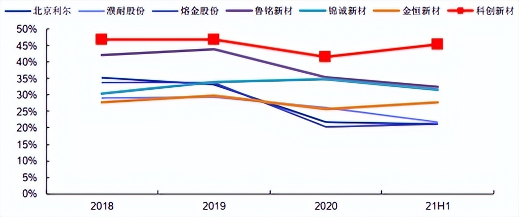 而从玩家们的财务表现来看,有关玩家的毛利率均较为接近,基本介于20%-40%之间。科创新材(833580)因为更专注于功能性耐火材料,技术门槛更高,所以毛利率较高也能理解。