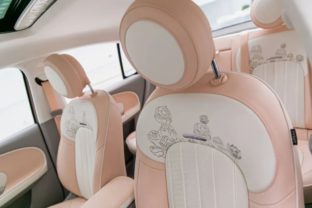 内饰采用了环抱一体式“花漾优雅座舱”设计。女性专属定制方向盘、女性专属定制窄肩座椅、钢琴式按键等。根据女性肩膀宽度、手掌大小等数据,将方向盘盘幅减小了5mm,方向盘直径为370mm,比传统方向盘减少了约10mm,让大家更好地握紧方向盘。