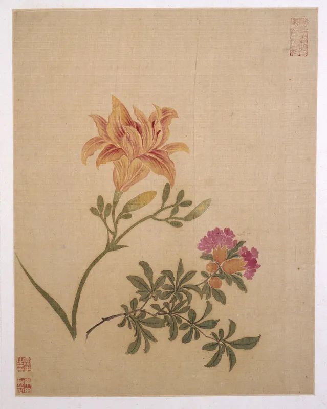第三帧,绘折枝石榴与金萱各一,二花各显姿媚,互不相连。石榴花开两朵,两颗花蕾为绿叶所簇拥,绿中有红。金萱一朵盛开,数颗花待放,花黄透红,绿叶相伴,似在迎风摇曳。其色调纯正俏丽,运笔滋润俊逸。在图的左下角钤有朱文“寿平之印”、“南田草衣”二印。