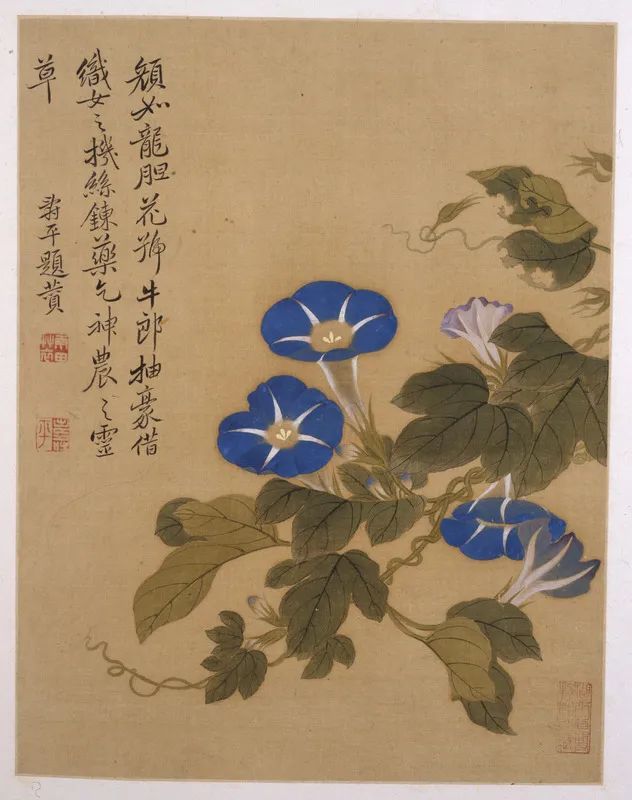 第八帧花卉,图左侧题曰:“颜如龙胆,花号牛郎。抽豪借织女之机丝,炼药乞神农之灵草。”题文中所赞述的正是在乡间随处可见的牵牛花。牵牛花不仅观赏,还可入药。这一丛牵牛花,花朵姿态各异,或仰、或正、或侧、或垂、或背,花苞数个,兰花白蒂,牵丝绿叶。其用笔秀逸,所绘牵牛自然可亲。款署“寿平题赞”, 钤印同上帧。