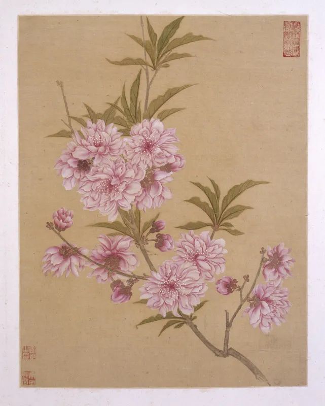 第十一帧为桃花,其构图是取桃树一枝,桃枝上的花有盛开的,有半开的,还有含苞欲放的,姿态各异,多瓣的花儿呈粉红色,树叶嫩绿。其造型新颖设色典雅。其独特的境意,予人以春意盎然之感。图左下角白文“寿平之印”、“南田草衣”二印。