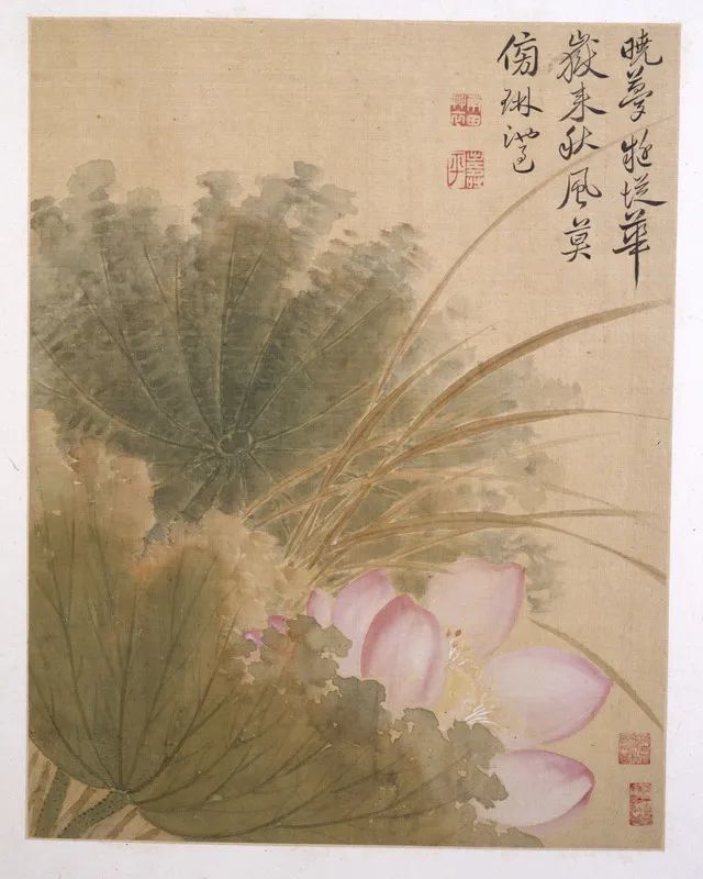 第九帧为两杆彩绘荷叶正仰欹斜,粉红的荷花脱颖于破叶丛中,枯黄的水草在微风中飘动。该图中运用色染水晕的技法,将荷叶枯破的笔触色调、花瓣的含放深浅、花蕊的清新可人都表现得淋漓尽致。能使人感受到秋天的意境,闻到荷花的清香。这帧最具恽氏花卉特色的荷花图,其意境正如画中自题所描述的那样:“晓梦疑从华岳来,秋风莫傍琳池过。”钤印同上帧。