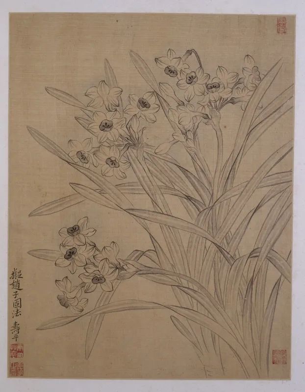 第四帧为水仙花,这里的数茎水仙,花盛叶茂,穿插有序。用笔细腻,墨色清淡,花的周围以青色淡淡地渲染,衬托出花朵的高雅洁净,显现出清新幽静的意境。图左下方题“拟赵子固法”,署款“寿平”, 钤印同上帧,右上角钤白文“园客”印。“拟赵子固法”并非学赵子固的画法,而是在当时的社会条件和文艺风气下的一种题字的习惯,正如钱钟书先生所指出的,无非是为了要“表示自己大有来头,非同小可,向古代另找一个传统作为渊源所自”(钱钟书《中国诗与中国画》)。