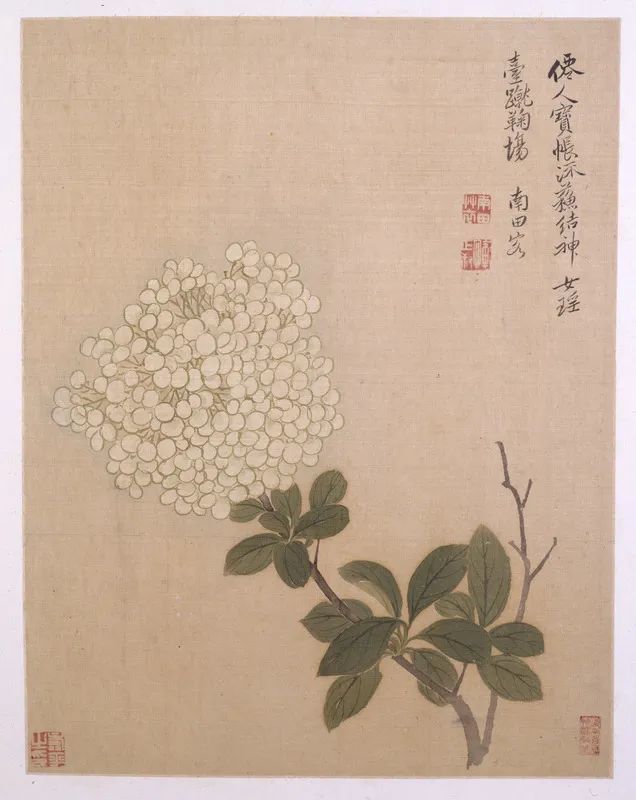 第十帧绘有荼靡一枝,这荼靡异常可爱,又大又圆的花团锦簇于枝顶,下有绿叶相伴衬。其构图简洁、敷彩清新典雅。图中素雅洁净的花团非常优美,它既像仙人宝帐上精美的“苏结”,又似天宫中仙女们游戏的皮球。上题:“仙人宝帐流苏结,神女瑶台蹴鞠场。”款署:“南田客”,下钤白文“南田草衣”、“恽正叔”二印。