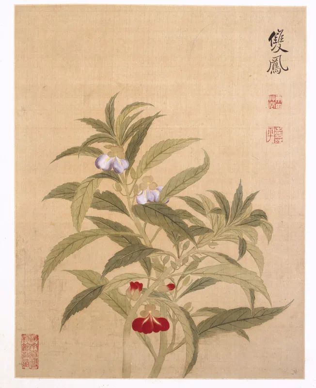 第七帧是两株交复穿插的凤仙花,一枝开红色花,另一枝开紫色花。盛开的花向下垂着,含苞的花向上仰着。枝杆上绿叶茂密,更衬花朵的艳丽多姿。图右上角题有“双凤”二字,钤印同上帧。双凤,即两枝凤仙花,凤仙俗称指甲花,过去妇女用其汁来染指甲。
