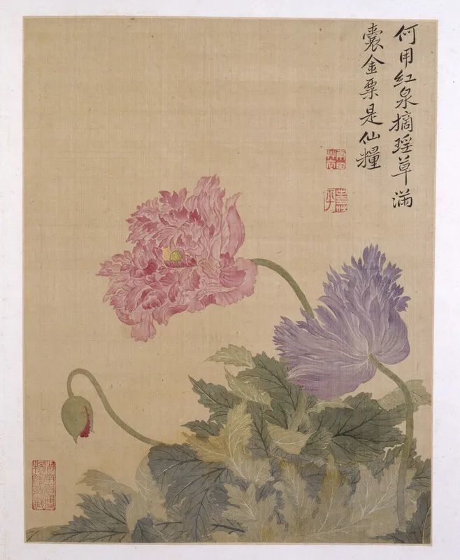 第五帧,花卉图上题有:“何用红泉摘瑶草,满囊金粟是仙粮。” 钤印同第一帧。诗中指的金粟即罂粟,画面为两朵盛开的罂粟花,一紫一红,正反相映,还有一枝含苞欲放。绿叶团团簇拥,向背浓淡有别。笔法细致,设色艳丽。作者笔下罂粟花的姿色极为迷人。