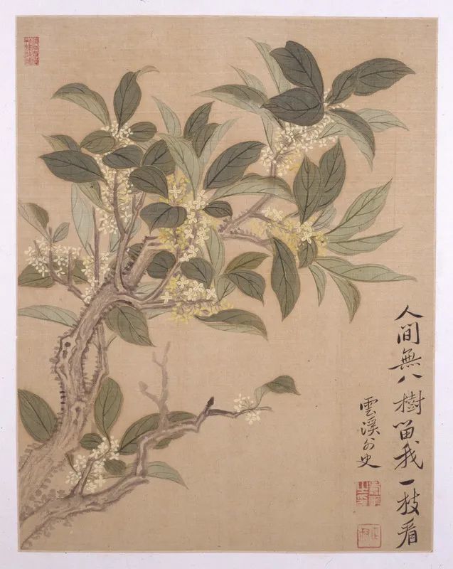第二帧花卉图,右下方自题:“人间无八树,留我一枝看。”署款“云溪外史”,下钤白文“寿平之印”、朱文“正叔”二印。从作者自题看,应是指天廷中的桂花树。所画的这一折桂枝,主干苍劲屈挺,枝干健拔而富韧性,干枝穿插有序,敷色纯朴素雅,笔墨粗细浓淡相宜。久观之似能感受到一股扑鼻的桂花香。