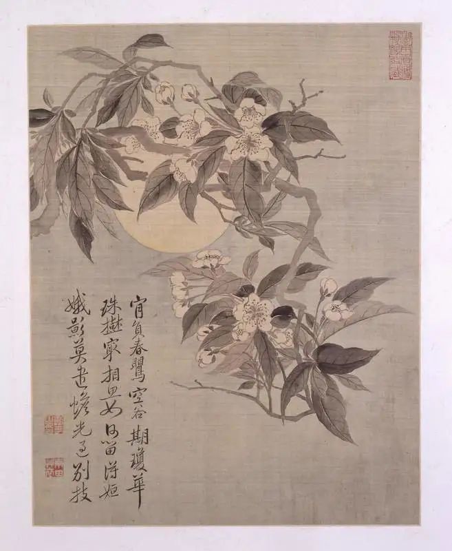 第十二帧的梨花图,构图取自上而下的梨梢一枝,枝头梨花簇簇,花蕊、花瓣皆用淡墨勾点稍染而成。周围簇拥的树叶树枝,以浓淡不一的墨色勾染而就。背景是圆月,月儿周围用淡淡的青色渲染。其笔墨秀逸细润,妙趣横生,具有清新静宓的境界。正如图中所题:“闲负春莺空谷期,琼华珠树最相思。如何留得姮娥影,莫遣蟾光过别枝。”钤印同上帧。
