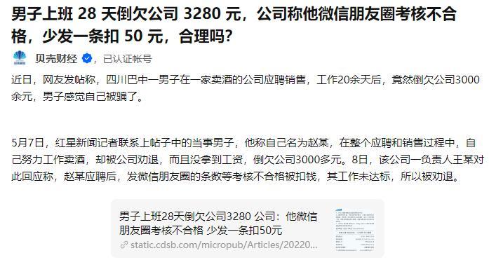 近日,一则“男子上班28天 倒欠公司3280元“的帖子上了热搜,引起网友热议。该公司负责人称,目前因考核不合格,已劝退该员工。