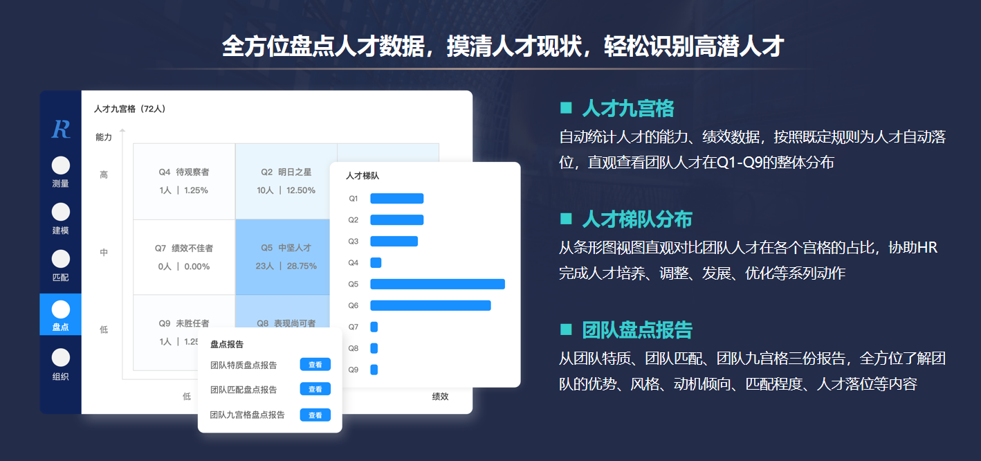 通过人才盘点,摸底公司人员能力优势,结合岗位模型,了解人岗匹配情况,进而发掘高潜人才,暴露摆烂的“猪队友”,打造一支能够带领企业高速发展的人才队伍。