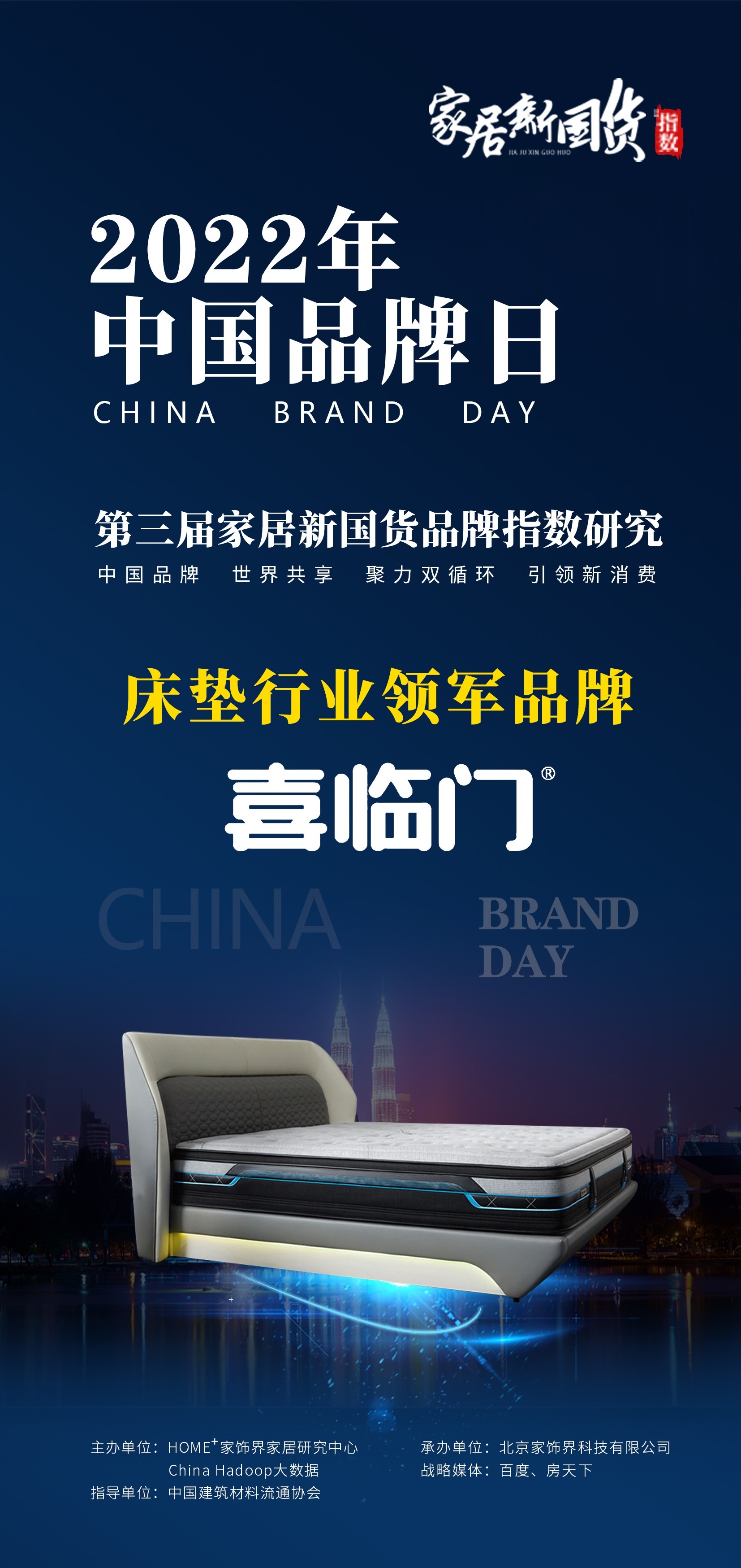 2022年5月10日,由HOME家饰界联合China Hadoop大数据主办的2022年第三届中国家居新国货品牌指数研究报告发布,喜临门凭借多年形成的综合竞争力与高品质产品力,在品牌增长力指数、科技创新力指数、社会责任指数、消费者满意度指数、网络影响力指数等方面以综合指数1769.9的傲人成绩荣获2022年中国家居新国货品牌指数研究床垫行业领军品牌称号。