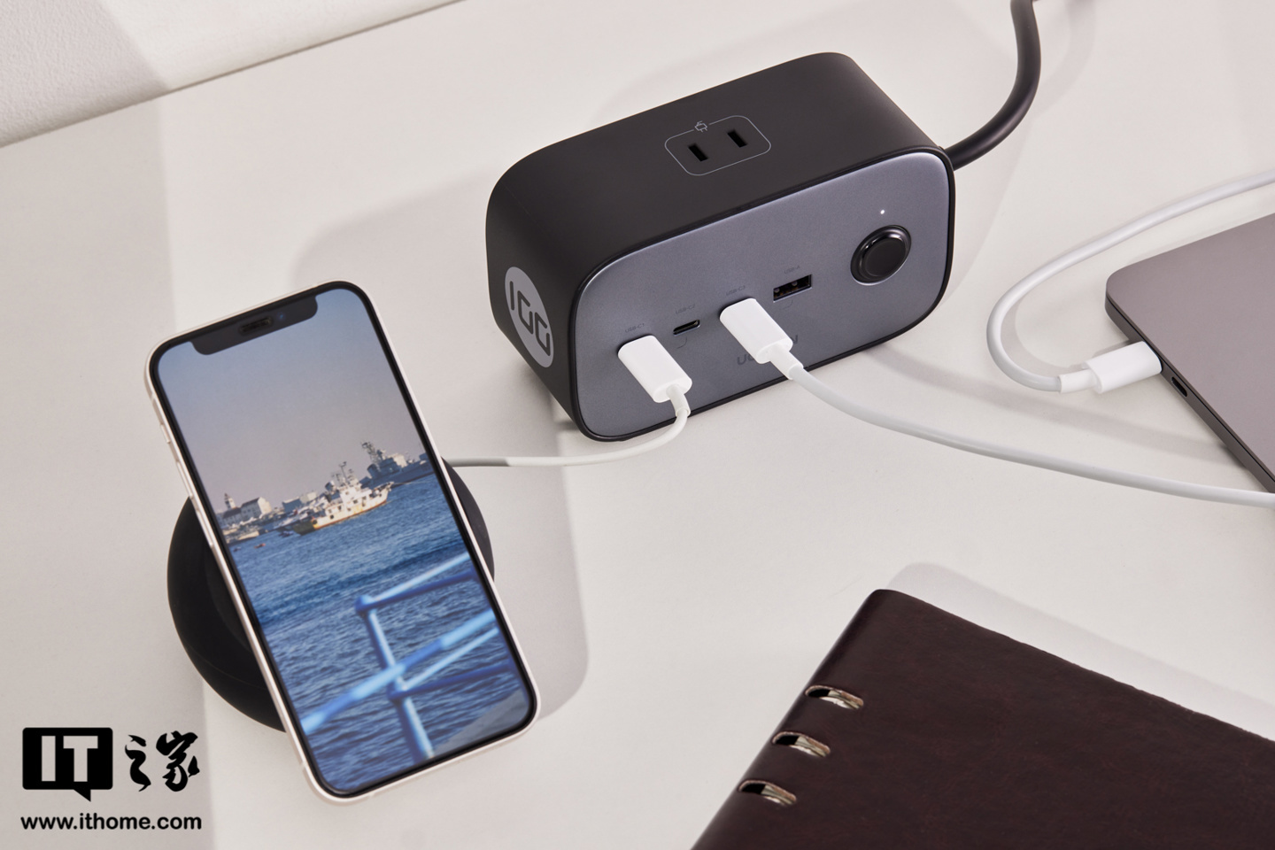 内部采用氮化镓技术打造出百瓦快充模块,3C1A 接口支持 100W PD 快充输出,性能足够日常使用,无需额外插入充电器即可实现手机、平板、笔记本、耳机一起充。