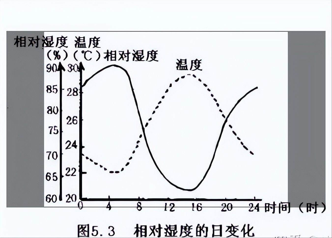 相对湿度每天有一个最大值出现在清晨,一个最低值出现在午后。