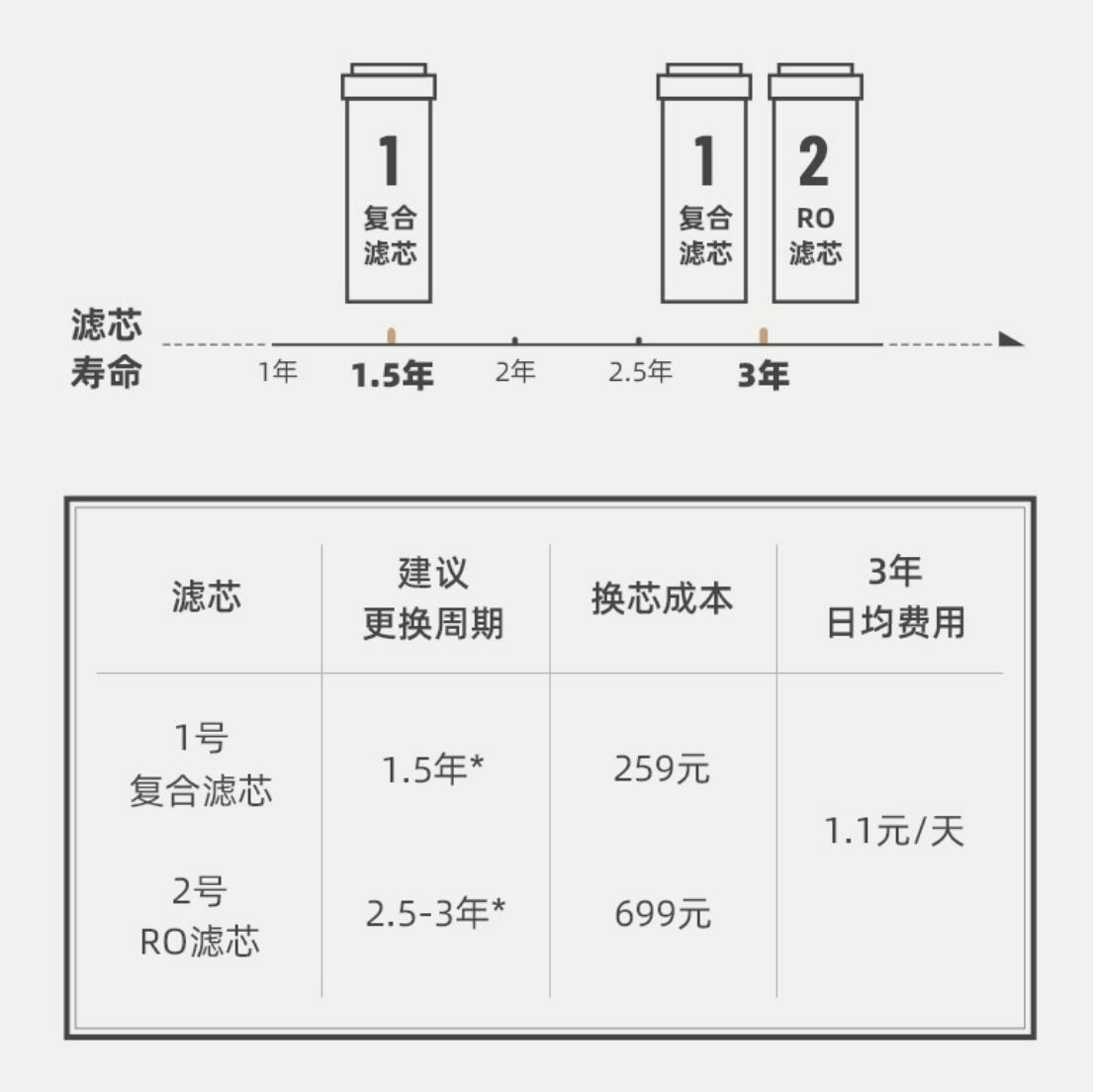 有时候,我们总是比较在意一次性投入,而忽略的后期的使用成本。对于市面的净水器来说,虽然看似它们的价格与性能参数都是差不多的,但是过滤技术与滤芯寿命的长短,导致后期的费用投入和使用维护成本有着巨大的差别。超大的额定净水量、超长的滤芯寿命既是滤芯品质的保证,也是便于维护、降低使用成本的保证。