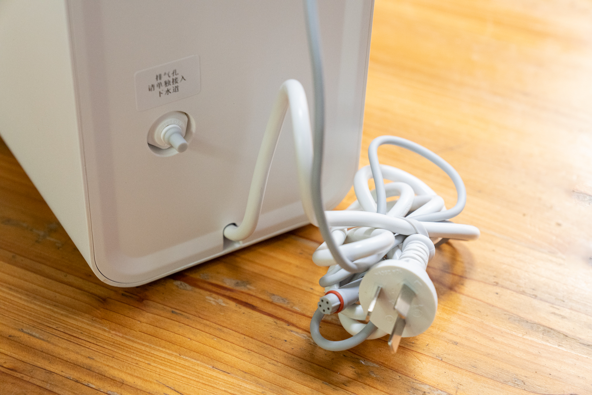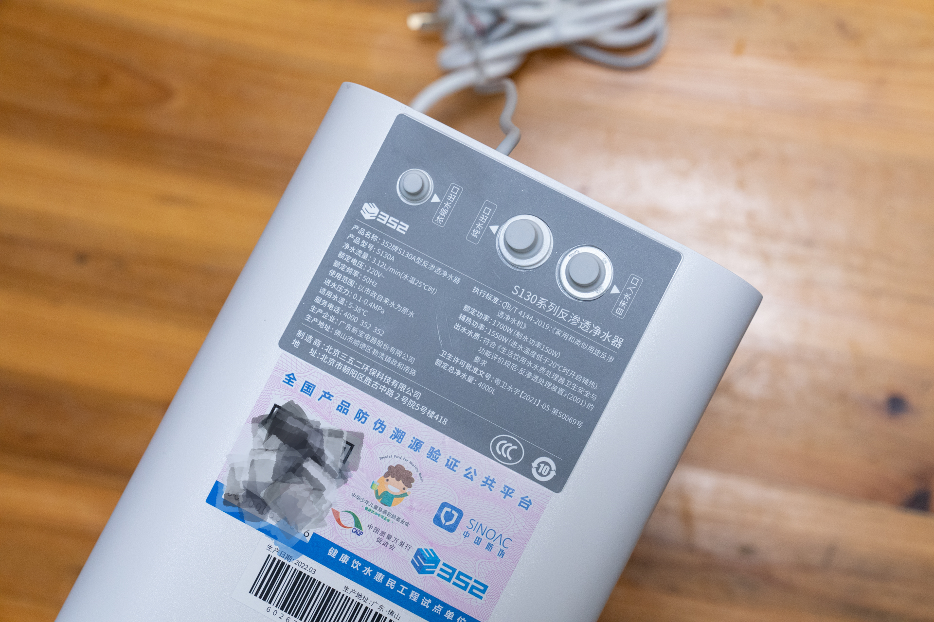 352净水器S130进出水口设计在机身顶部,并有贴纸标识各个口的说明和S100净水器的性能参数。