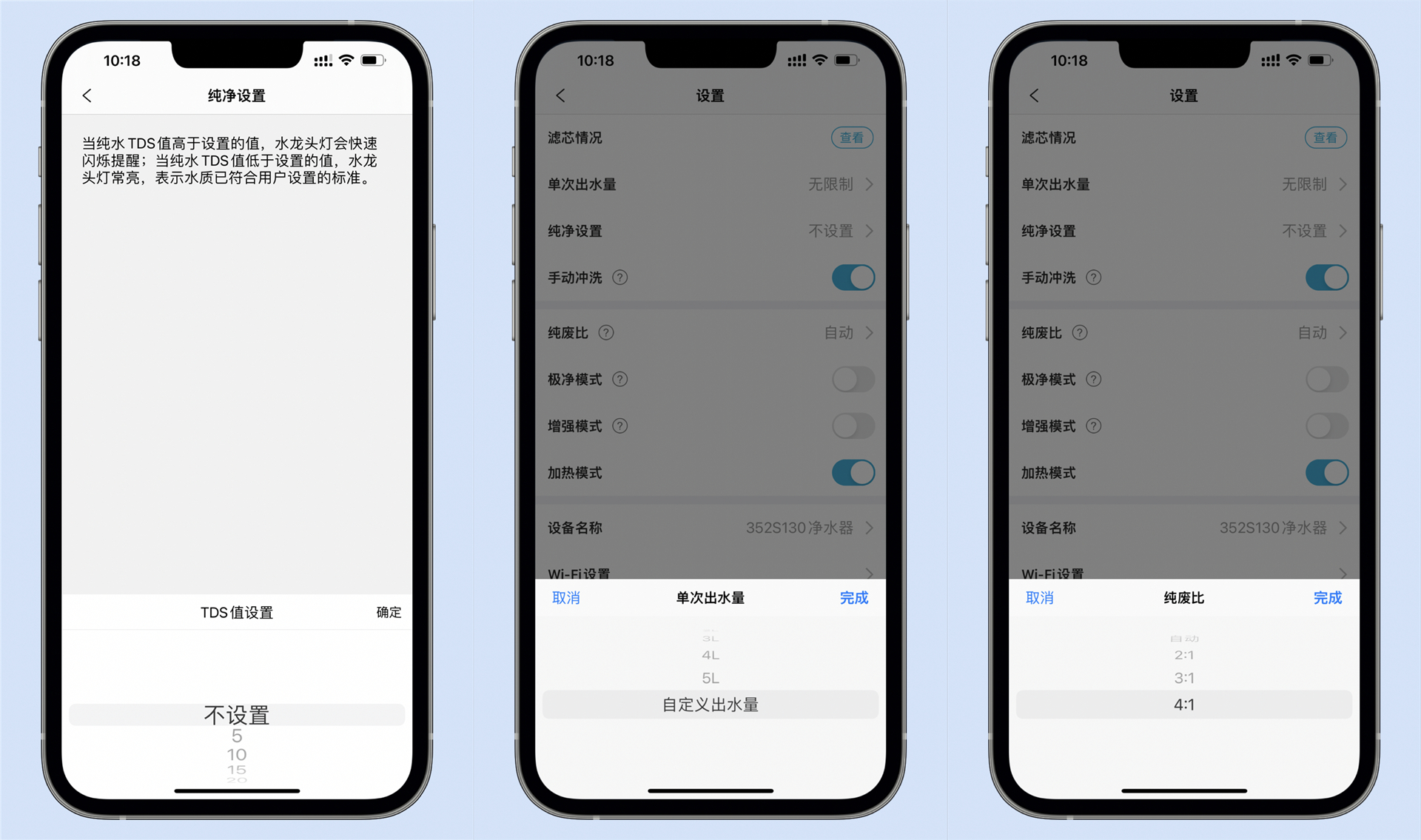 APP还可以设定纯水TDS值、纯废比和单次出水量(200mL~5L或者自定义出水量),这样对于厨房用水煲汤什么的就非常方便了,可以精准掌控需要多少水量和出水状态等。