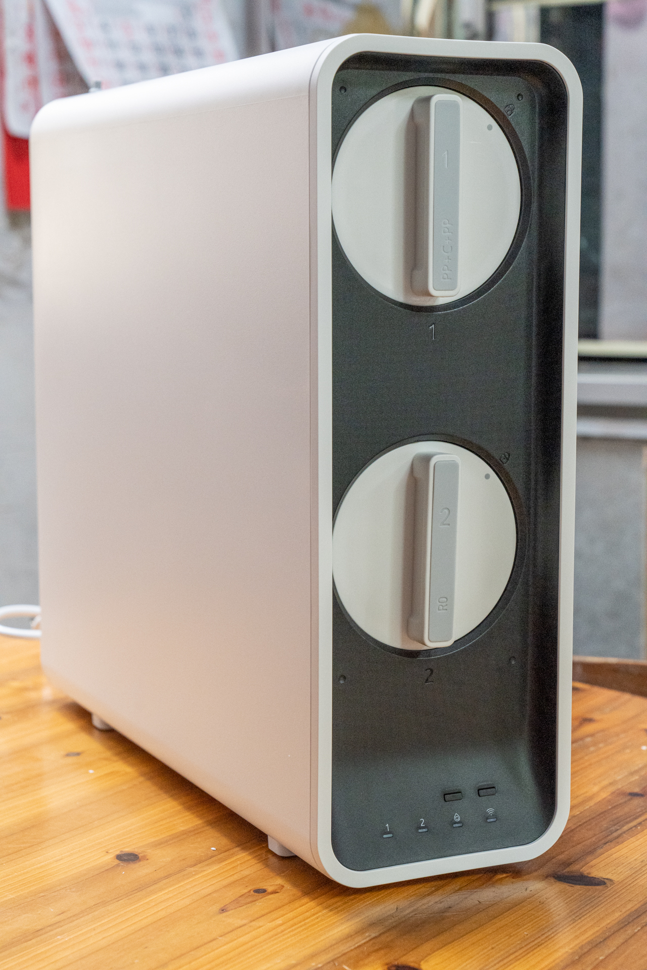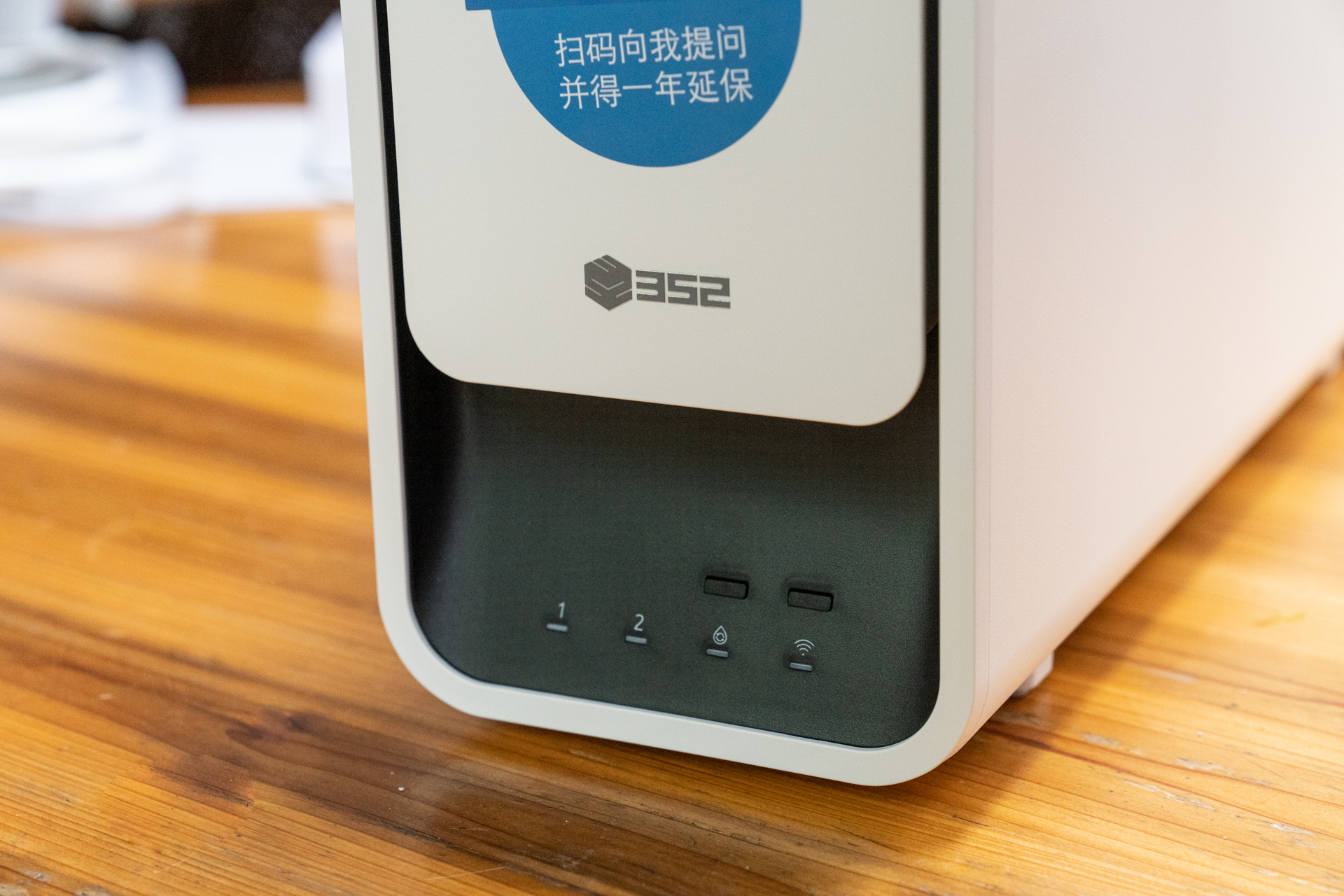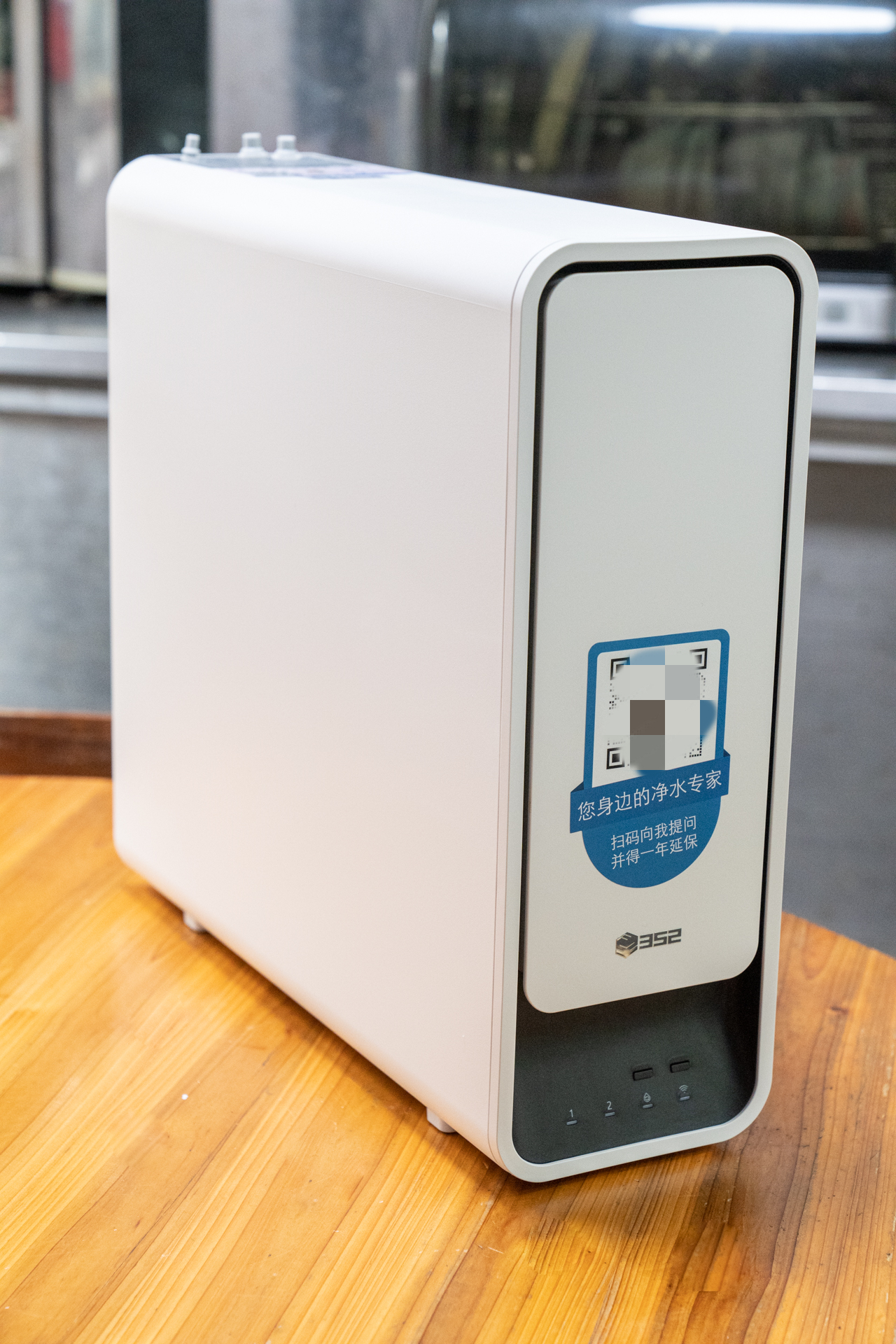 352净水器S130的指示灯下置倾斜设计,方便观察。在摆放入橱柜时,把指示灯的那面朝外即可。在自动调温和联网指示灯上有2个按键,分别对应控制调温智能辅热功能和联网配对功能。
