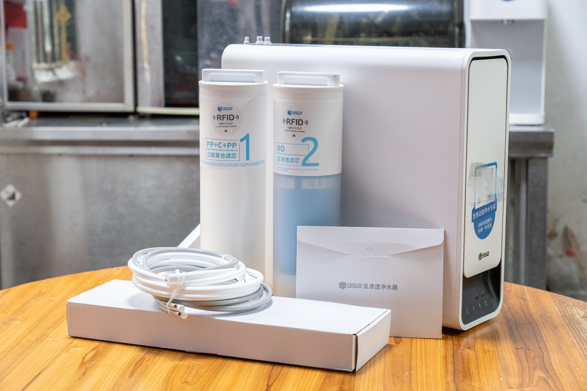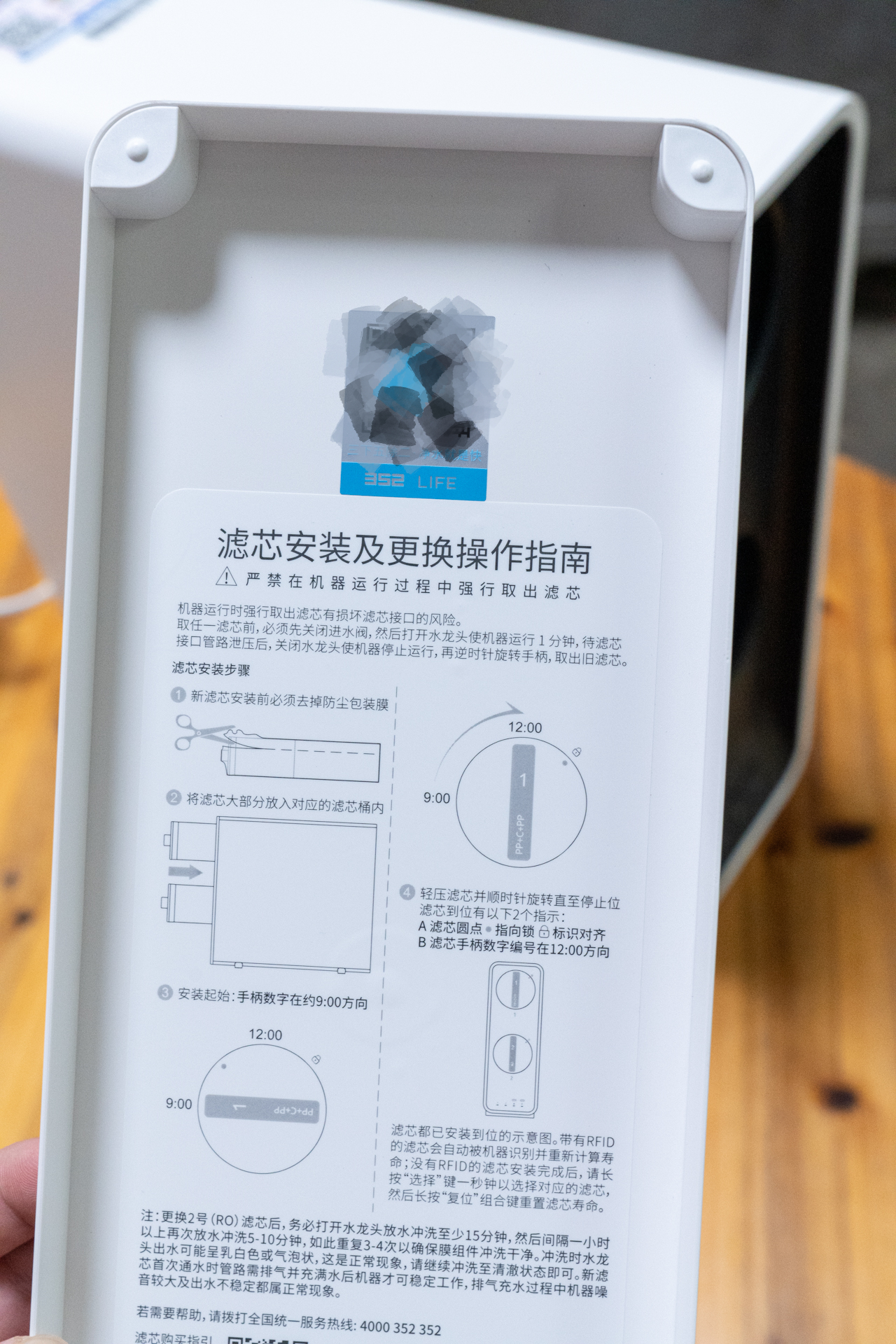 352的包装非常好,净水器主机采用了真空包装,滤芯已经预安装好,可以避免灰尘污染这些核心部件。另外,还有智能净水龙头、不同颜色的水管等配件。352的安装服务,在我收到净水器前已经有客服跟进安排预约安装,说明352对于用户的安装工作都是跟进到位的,同时也给我做了介绍:安装过程中对于首次安装、远距离上门安装、拆除旧净水器、安装辅材、水槽打孔等服务全免费。