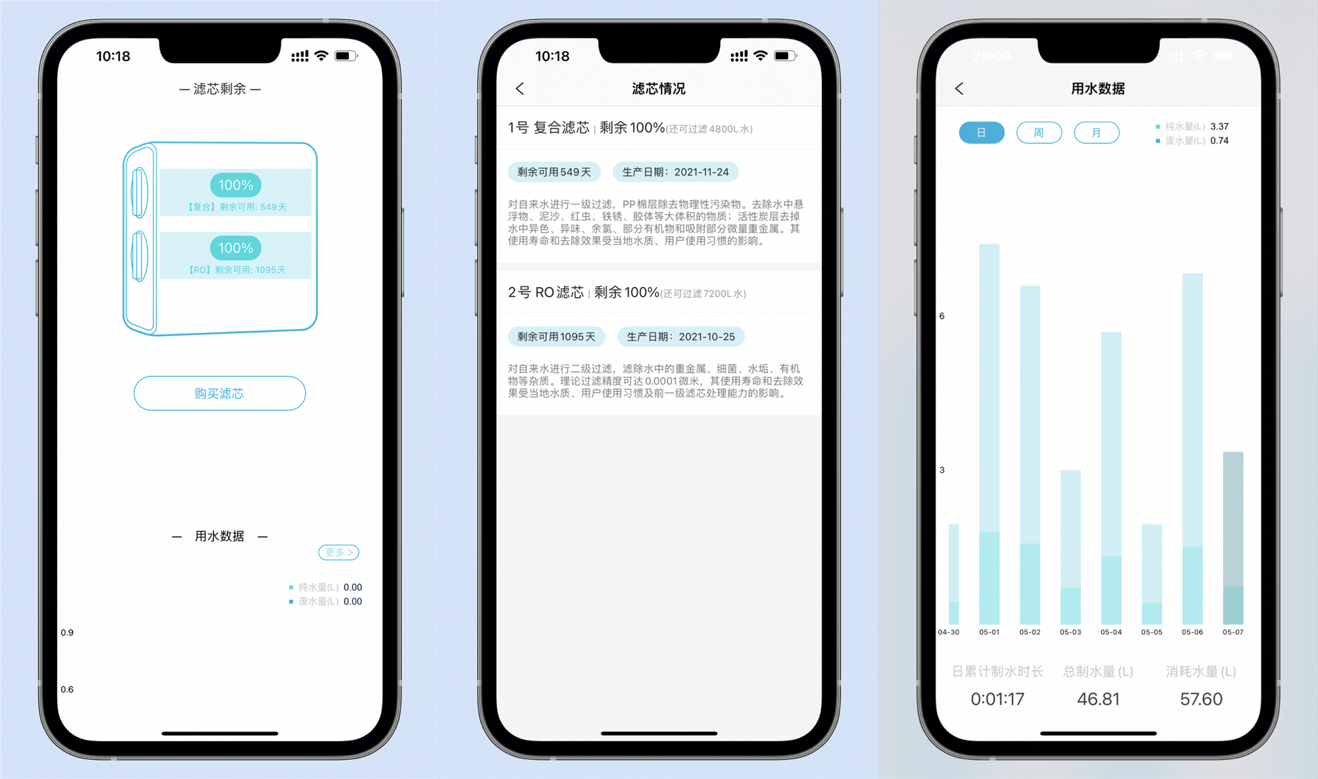 在APP上还可以查看总制水量、总废水量、纯度比、2支滤芯的寿命百分百和可用天数等。