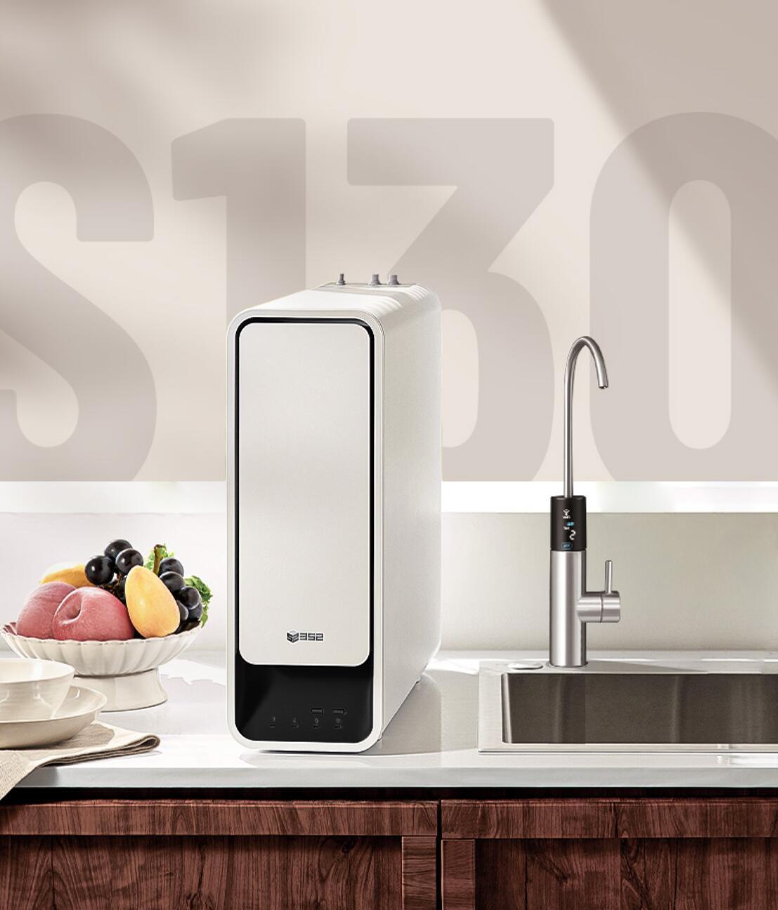 最近家里的净水器坏了,更换一个新的净水器,最后入手的是352反渗透净水器S130(下文简称:352净水器S130)。选择它的原因很简单:原本使用的净水器是400G通量,再用水方面等待时间过长,现在换成1300G通量,可以节省盛水时间,并且4:1的动态纯废水比,非常节省用水;还支持全时0陈水和UV-C深紫杀菌等。