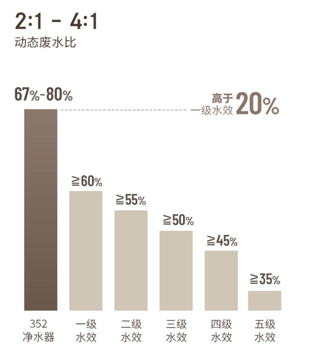 废水比率也是选购净水器的参考数据,通常净水器的废水比都会在2:1,也就是产生两杯水有一杯水是废水,配置再好一些的产品可以做到3:1,而352净水器S130可以做到动态废水比4:1的比率,也就是有4杯纯净水产生一杯废水的比例,很大程度上节约了水资源浪费的问题。