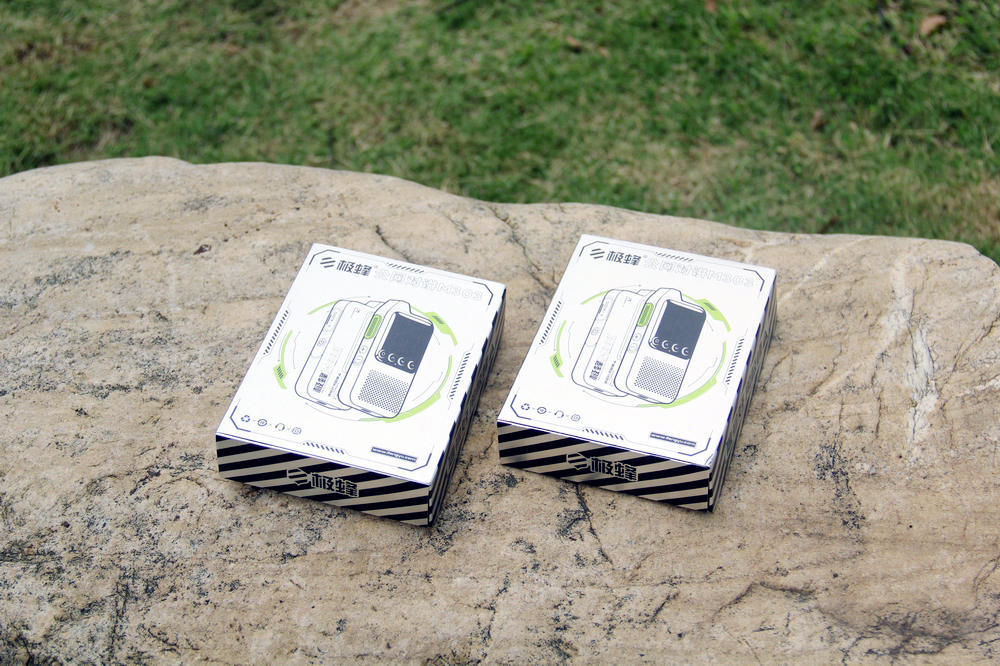 极蜂公网对讲机M303的包装设计很特别,亮银的底色配上黑色的涂鸦图案,用色很大胆,科技感十足,特别能吸引眼球。包装的背面把产品的主要参数都列出来了,最值得说的是包装侧面印的六个大字“信号好,用极蜂”,信号是对讲机最关键的因素,敢把这句话写出了,说明极蜂还是很有信心的。