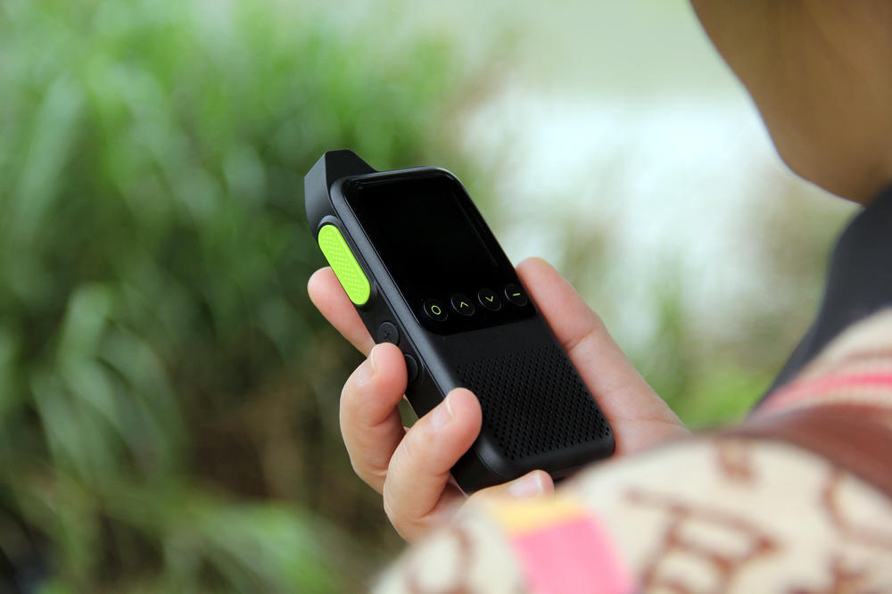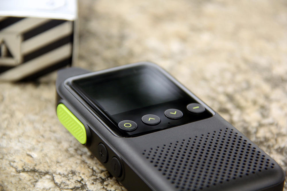 有人说这不就是一台手机的外观么?其实看上去确实像一台手机,但整个设计却是完全按照对讲机来设计的。正面分了三个部分,上面是一块1.77英寸的屏幕,可以随时查看设备状态、群组信息、成员信息等等,相比无屏幕的对讲机操作就简单多了。中间有一排四个按键,对应屏幕上的各种操作。下面是一颗36mm大口径扬声器,功率达到了2W,声音大而且不刺耳,这喇叭质量还是很不错的。
