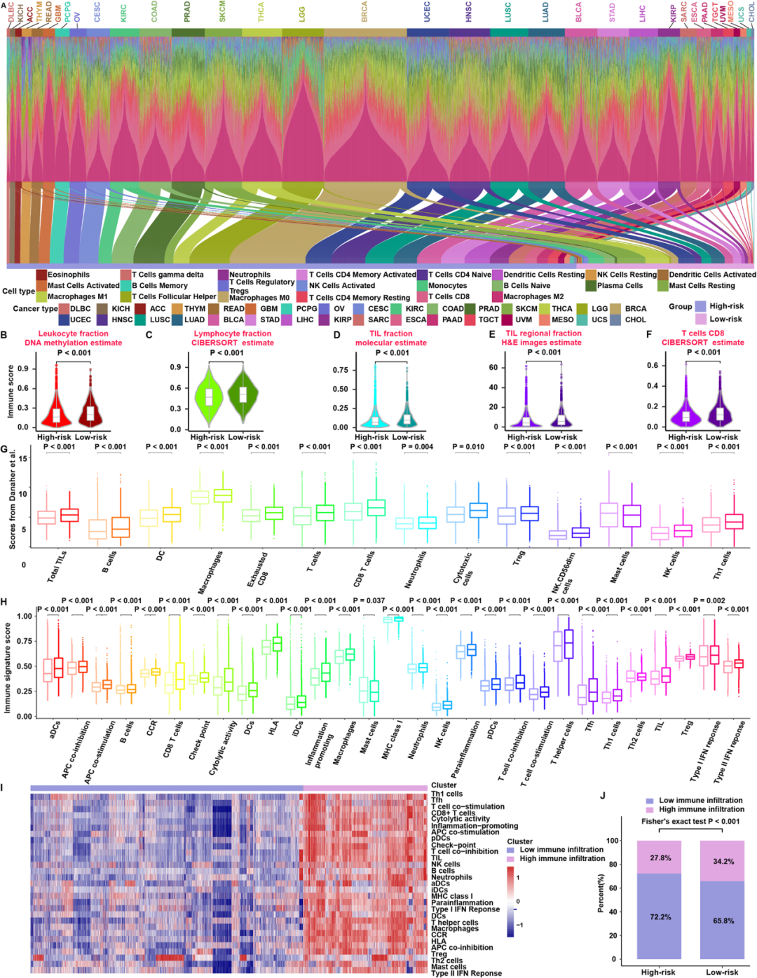 图4. 高低风险组潜在的外在免疫景观。
