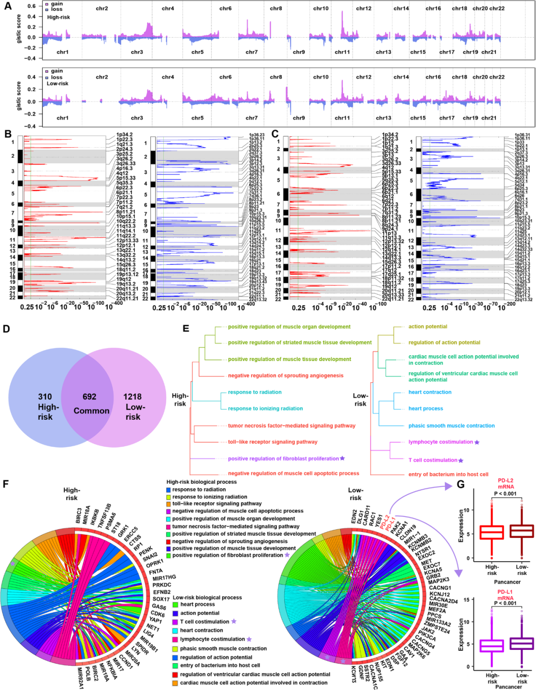 研究团队在高低风险组检测到显著差异的染色体变异(图6A)。低风险组观察到特征良好的免疫基因(如PD-L1 (9p24.1)和PD-L2 (9p24.1) )的局部扩增峰(图6B, C)。对特异扩增的基因进行GO功能注释,低风险组显著富集了2个免疫相关的生物学过程,高风险组显著富集在“成纤维细胞增殖正调控”这一生物过程,没有富集在任何免疫相关的生物学过程(图6E)。在TCGA队列的mRNA表达水平上,低风险组PD-L1和PD-L2 mRNA表达显著升高(图6G),与CNV数据一致。这一发现表明肿瘤中的CNVs有助于观察到的免疫浸润差异。