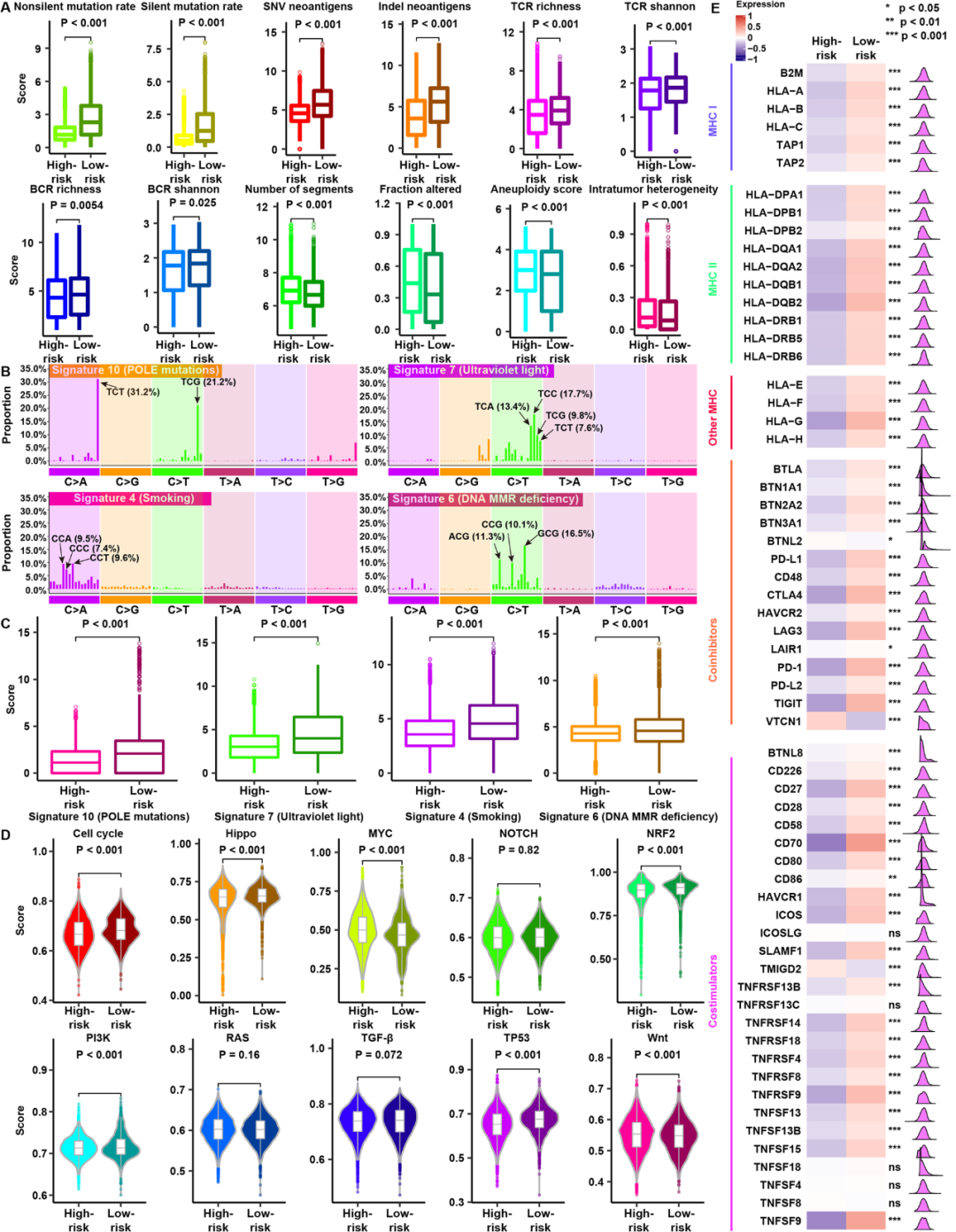 研究团队比较了两组间决定肿瘤免疫原性的一些潜在因素。低风险组的突变和新抗原负荷以及TCR、BCR多样性均显著高于高风险组,但高风险组的CNV负荷和非整倍体均高于低风险组(图5A)。这一结果与先前研究一致,即肿瘤非整倍体与免疫治疗以及免疫逃避标志物反应降低有关。此外,高风险组的肿瘤异质性高于低风险组,进一步支持了该观点,即在存在细胞溶解活性和较少的主动浸润免疫细胞的情况下,肿瘤会促进异质性的发展。为进一步了解高低风险组的突变过程,研究团队根据体细胞突变数据描述突变特征,并在TCGA队列中确定了四种不同的突变模式(图5B)。该四种突变信号在低风险组中出现的频率明显高于高风险组(图5C)。此外,研究团队还发现免疫检查点分子(如PD-1、PD-L1和CTLA4)和共刺激分子在低风险组中表达更高(图5E)。