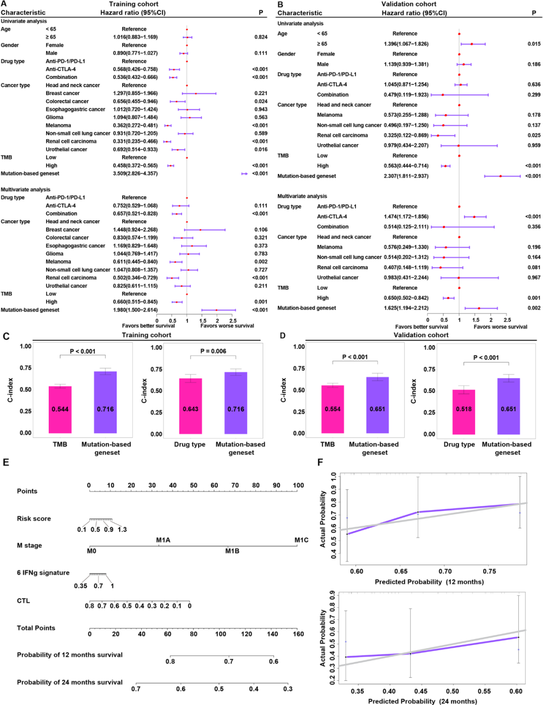 接下来,研究团队验证了基于突变的基因集是否是免疫治疗反应的独立预测因子。在训练和验证集中,单因素COX回归分析显示,该基因集与OS相关。在校正药物类型、肿瘤类型和TMB等变量后,多因素COX回归分析显示,该基因集仍然是独立的预测因素,并证实了其独立预测ICI预后的稳定性(图2A, B)。同时,研究团队利用C-index比较了基于突变的基因集和TMB、药物类型的性能,以确定哪个因素具有最好的预测性能。C-index结果显示,在训练集和验证集中,基于突变的基因集能够比TMB和药物类型更准确地预测预后(图2C, D)。