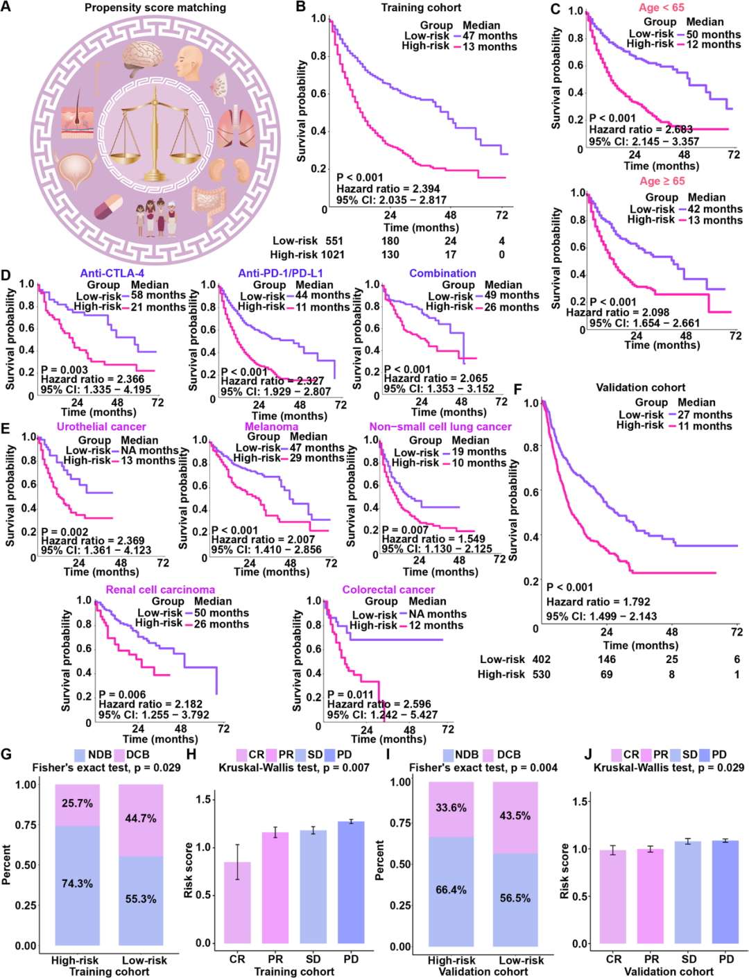 研究团队比较了训练集468基因在野生型和突变型中的生存差异,得到98个与OS(整体生存)相关的基因,经LASSO COX回归分析进一步筛选,最终得到11个重要基因。在11个突变基因集的基础上,对每位癌症患者的风险评分进行量化。训练集中,高风险组患者的OS较低风险组患者短(图1B)。为分析该基因集是局限于特定的群体还是适用于不同的人群,对不考虑年龄、用药类型、癌种的亚组分析表明,该基因集与ICI治疗患者的OS显著相关(图1C-E)。