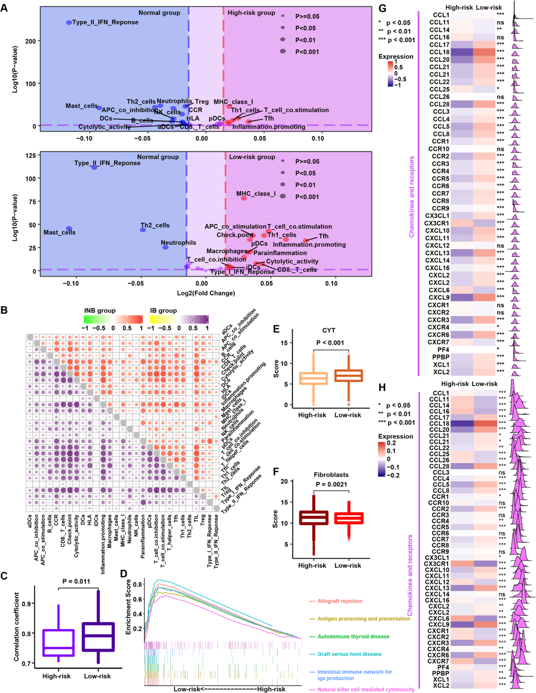 此外,低风险组在癌组织的免疫signature明显高于癌旁组织;相反,高风险组在癌组织的免疫signature明显低于癌旁组织的(图4A)。低风险组的免疫活动相关性显著高于高风险组(图4B, C)。GSEA结果显示,低风险组中有13条通路显著富集,包括6条免疫相关通路,例如“自然杀伤细胞介导的细胞毒性”等(图4D)。低风险组肿瘤与显著较高的CYT评分相关,高风险组中的成纤维细胞数量增加(图4E, F)。根据上述结果,研究团队推测低风险组丰富的免疫细胞,可以响应ICI治疗,成纤维细胞可能有助于高风险组的逃逸。低风险组的趋化因子表达较高(图4G, H),因此,研究团队推测低风险组趋化因子的富集可能引发免疫反应。
