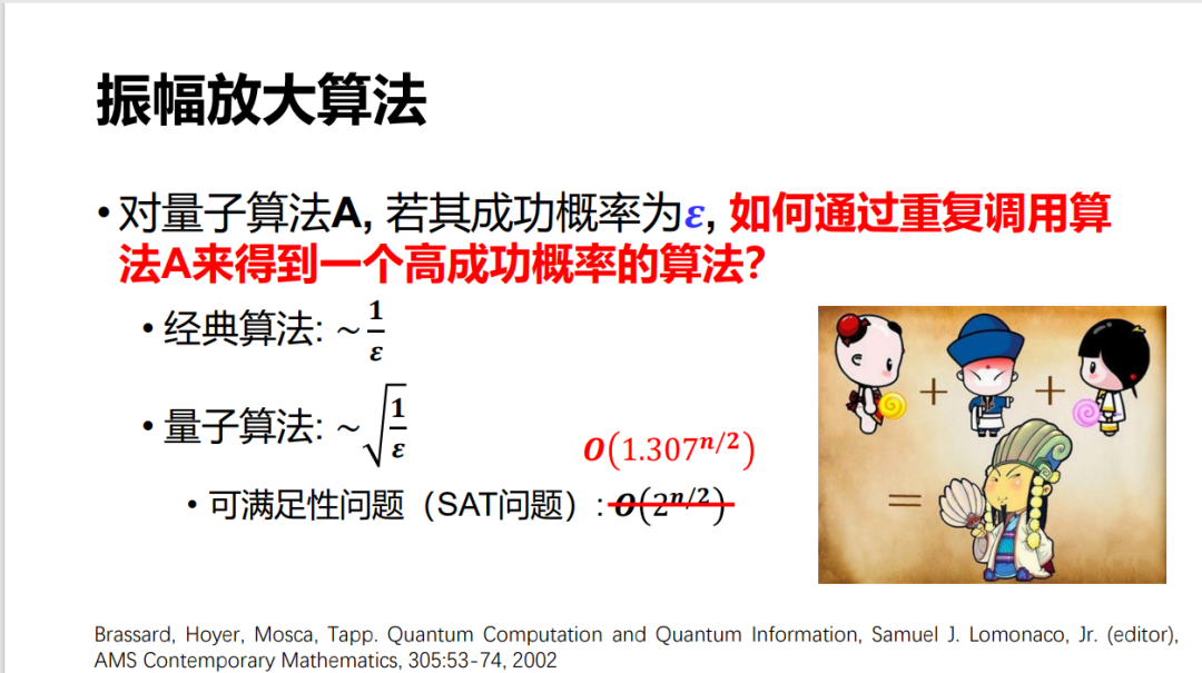 古人常说,「三个臭皮匠顶个诸葛亮」。如果每一个算法的成功概率是万分之 1,那么我们平均要重复 1 万次。但是,使用振幅放大算法的思想(它和 Grover 很像)可以做到开平方,也就是说本来要 1 万次,其实只需要大约 100 次这个量级就可以做成。
