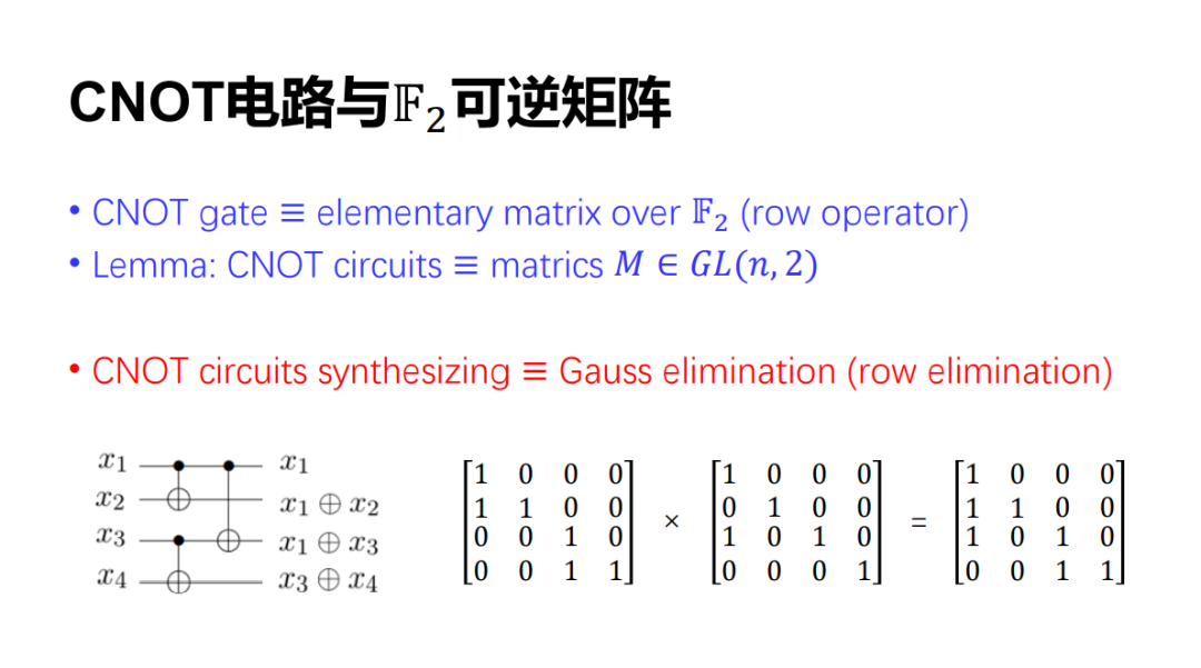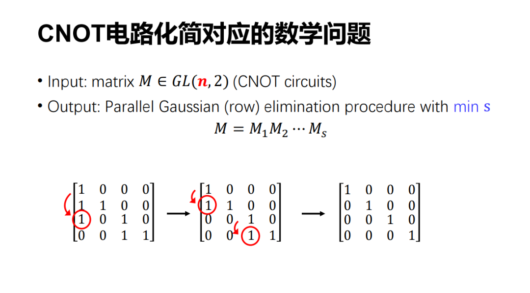 所以,CNOT 电路的化简可以变成这样一个数学问题,即如果允许并行的高斯消元,要把一个可逆的矩阵化成单位阵,最少需要多少步?注意每一步可以并行地来做。