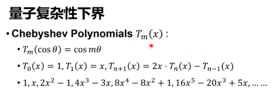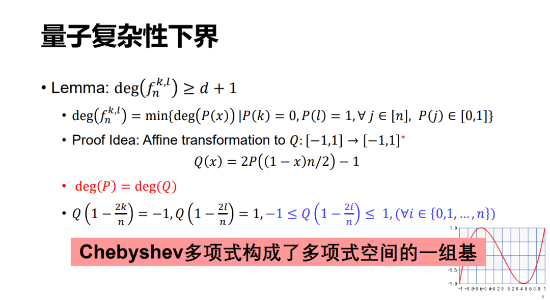 Grover 搜索背后的关键其实也是这样一个切比雪夫多项式。我们在这个工作中也要用到它,最关键的一点就是切比雪夫多项式构成了多项式空间的一组基。接着我们把任何一个多项式展开到这组基上,再利用切比雪夫多项式的一些性质证出来一个下界。