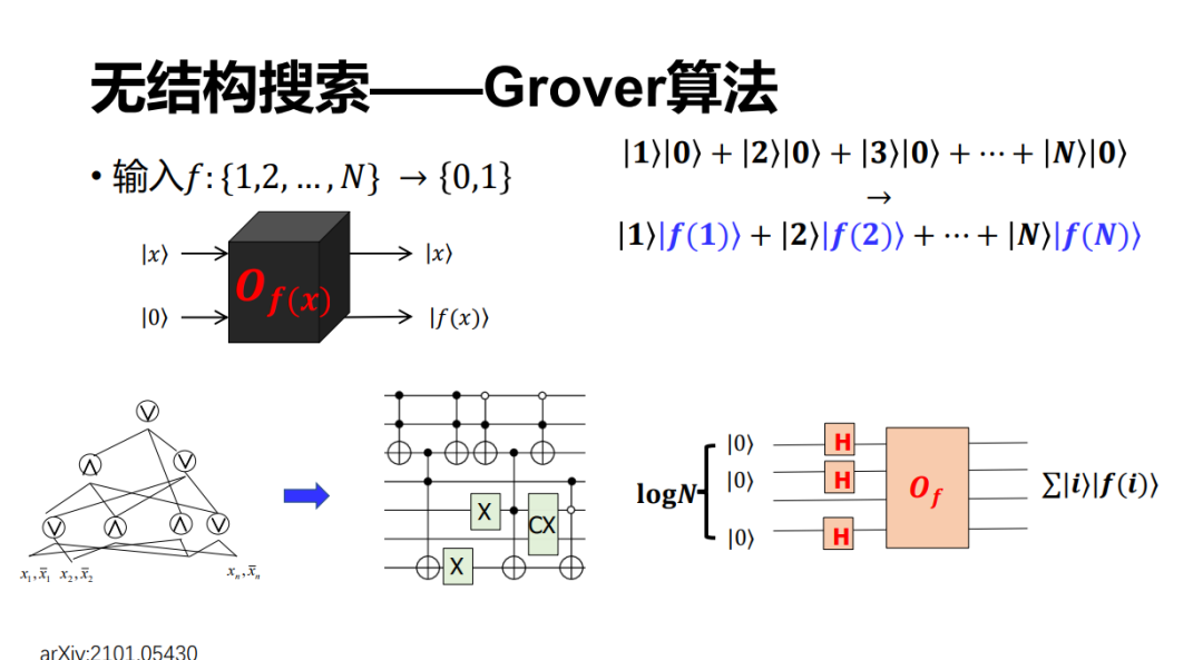 对于 Grover 搜索,它里面要用到一个很重要的模块——Oracle。我们经常会看到这样一种说法,如果有 50 个量子比特就可以实现 2 的 50 次方的并行加速,这件事情基本上是对的。他其实在说这样一件事情,如果可以制备 n 个比特的叠加态,譬如我们记 n 是 logN 的话,那么事先制备 n 个零态,然后做一个 Hardmard 变换之后,它就可以生成所有的从 1 到 N(或者从 0 到 N-1=2 的 n 次方减 1)个计算基的叠加态。然后根据线性性,它经过一个 Oracle 之后就可以计算全部的 f(x)(x=1~N),会得到这样一个态(图中包含蓝色的叠加态)。