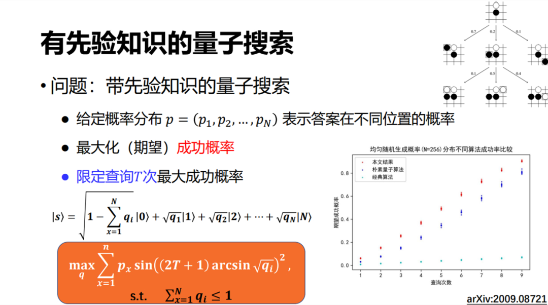下面介绍我们最近做的另一个工作,称为带先验知识的量子搜索。由于在 Grover 搜索中,我们对想要找的解一无所知,也就是说它是任何一个的概率都是相等的。但在有些搜索问题里,比如α-β剪枝,我们事先知道一定的概率分布,即走哪条路的概率更高一点。