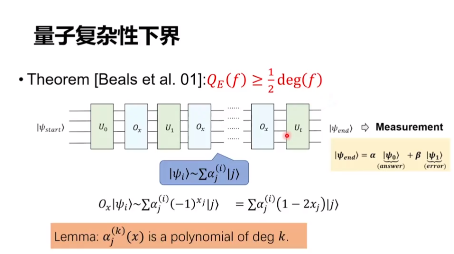 同时我们还做了一个下界,也就是说,我们可以证明在一些区域上量子不能做得特别好。其中最核心的一个定理是 2001 年 Beals 等人证明的一个结论,对精确量子算法,它的复杂度可以被这个函数写成一个多项式后它的 Degree 除以 2 给出一个下界。所以,我们就可以把这个问题转化成去考虑它的多项式表示的多项式次数。