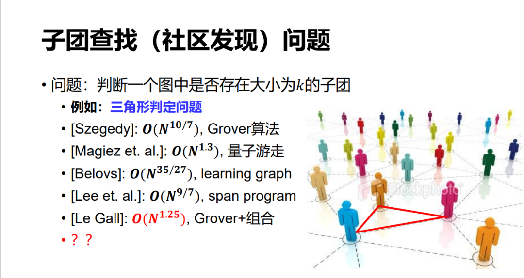 另外还有一些问题,比如在大数据里,我们经常想在一个社区里找一个子团,哪怕是找一个三角形这样最简单的子团。其实,这个问题到现在都不知道它最好的量子算法可以做到什么程度。
