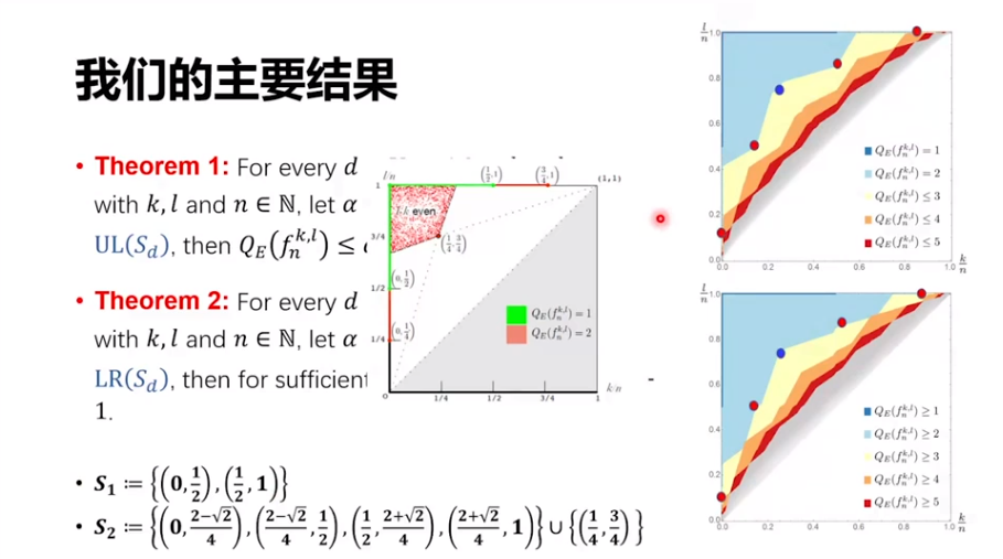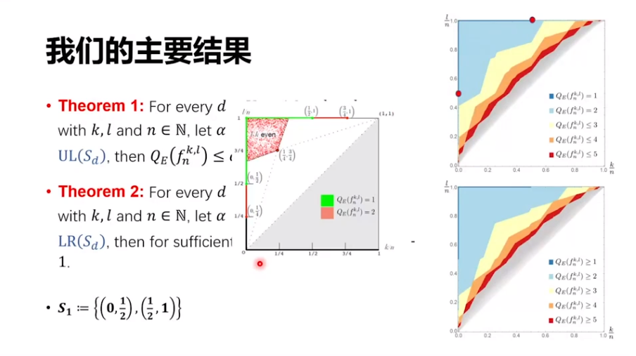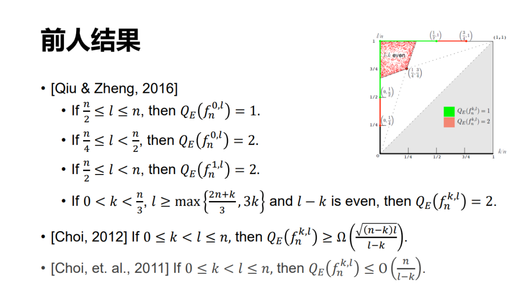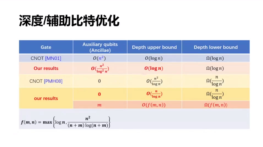 这是之前的结果,辅助比特达到 n^2 的时候有一个结果,辅助比特为 0 的时候也有一些结果。我们可以把两边的结果都加以改进,而且还有一个更一般性的结果,就是如果有 m 个辅助比特,那么这个电路深度可以优化到一个紧的界,即下图右下方的表达式。特别的当 m 等于 0 和 m 等于 n^2 的时候,我们的结果分别可以把原来的两个界优化一些。