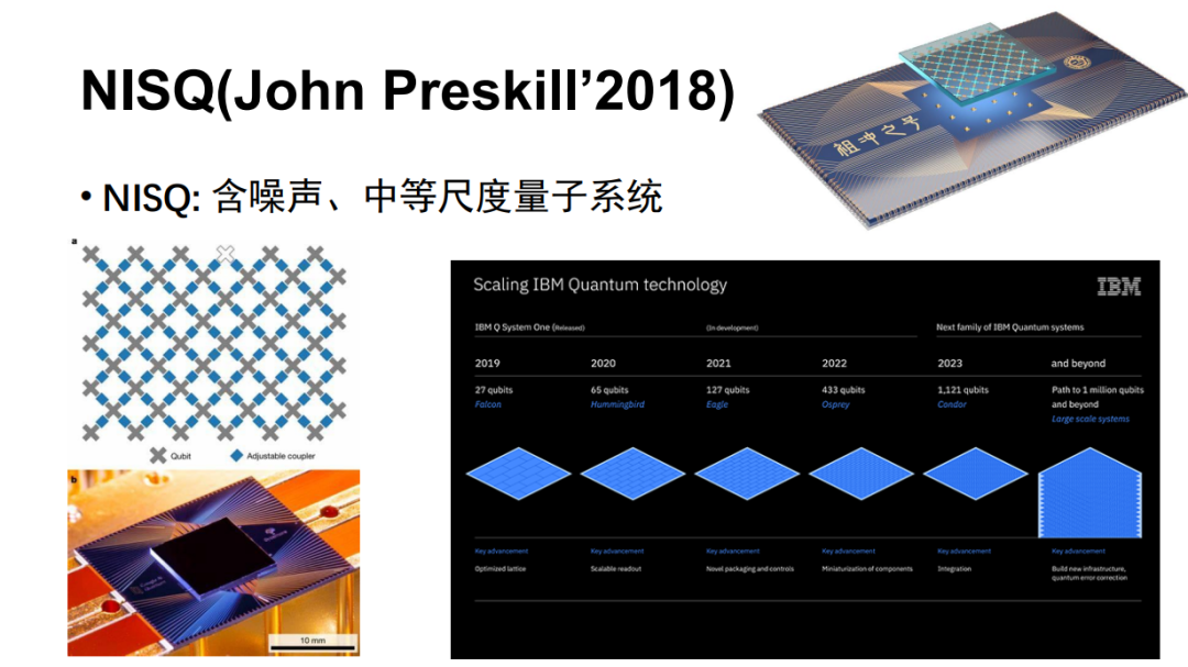 下面再简单介绍一下量子电路优化方面的工作。最近,量子硬件发展很快,John Preskill 教授在 2018 年提出了一个概念,叫做 NISQ(含噪声、中等尺度量子系统)。刚才胜誉也提到 IBM 有个路线图,称明年就可以做到 1000 多个比特。但是,它的特点是噪声很大,所以需要压缩电路的深度。