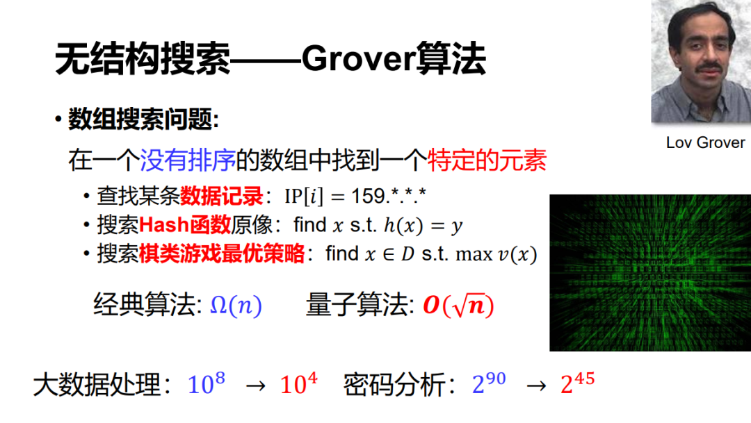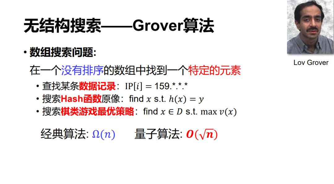 Grover 算法可以在一个无序的数据库上去查找一个特定的元素,比如想在一个数据库里查一个特定的 IP 地址,或者找一个哈希函数的原像,以及棋类游戏的最优策略,都可以看作一个搜索任务。