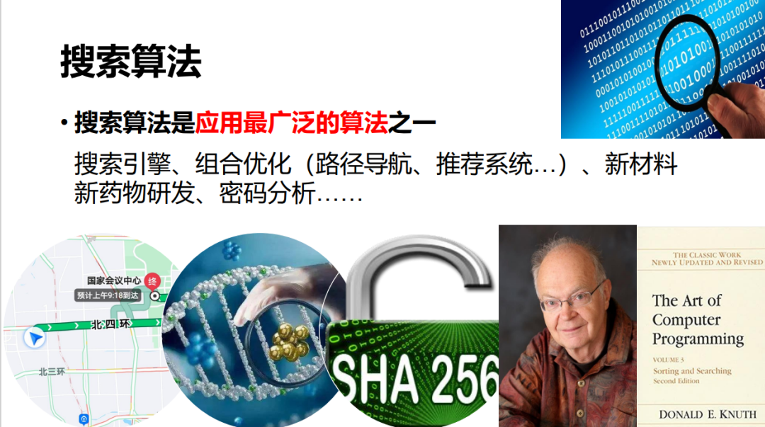 我今天想要介绍的是关于量子搜索算法与线路优化,重点介绍搜索这部分。众所周知,搜索是在经典计算机上面应用最广泛的算法之一,它可以应用于搜索引擎、路径导航或者推荐系统等。现在它还可以应用于新药的研发,甚至我们可以将密码破译看成一个搜索问题。