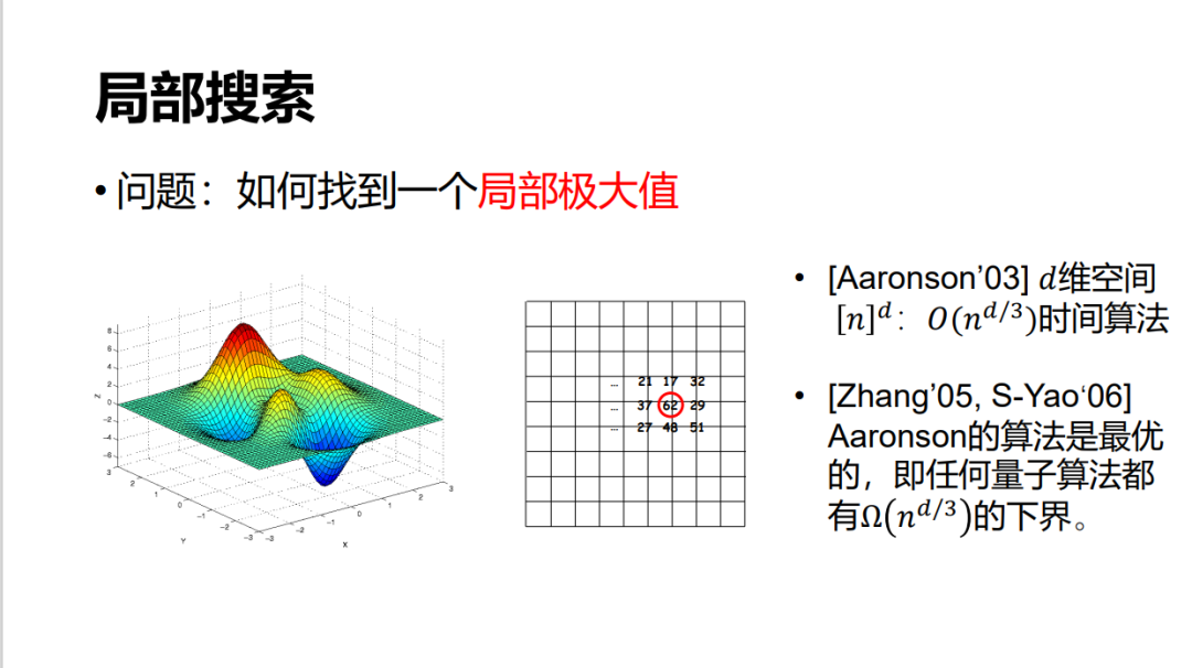下面介绍我与胜誉以前共同做的一个工作:Grover 搜索可以用来解求全局极值,即需要根号 n 的时间就可以找到一个全局极大值或极小值。如果我们只需要找一个局部极值,譬如在机器学习里有很多应用,很多时候其实找一个局部极值就可以。