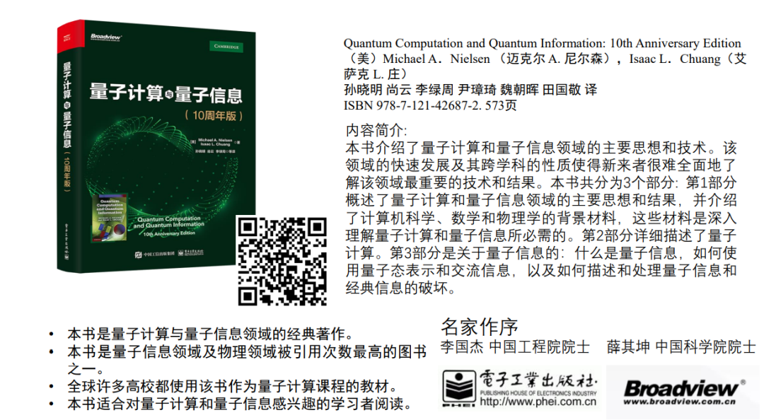 我们觉得它是一本非常优秀的教材,即使从现在的角度来看。当然,这本书确实缺少一些比较近期的(比如在硬件实现方面)内容。但是它作为入门教材对读者非常友好,特别是如果你从属于计算机领域,并且想要学习量子计算,那么你只需要掌握最基本的线性代数知识,阅读这本书就完全没有问题。