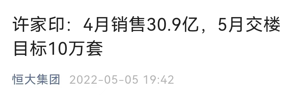 恒大集团董事局主席许家印曾在5月5日的月度工作会议上表示,“销售的恢复,对恒大、对业主、对上下游合作伙伴、对所有债权人来说,太重要了、太重要了。”